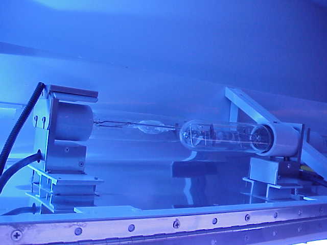 Four Ice cap temperature sensitive three speed fans running. (they have sensors that are heat sensitive which change the speed of the fans) Two sucking on one end & two blowing on the other. It doesn't get hot because it circulates the air throughout. It does heat the water up a bit though.(bulbs are about 10 inches from the water surface) Chiller works when all lights are on even in the winter.