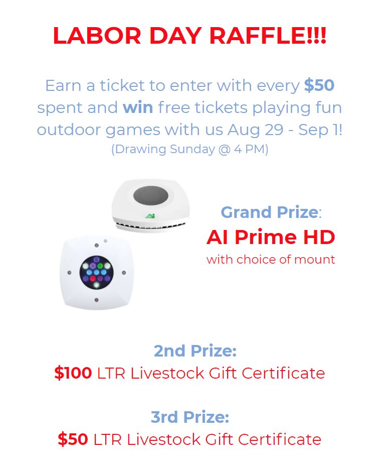 TODAY IS THE DAY!!! The LTR Labor Day Cookout is on and better than ever this year! Bring your Family for Food, Raffles,Prizes, Touch Tank, Games and Sales! 20% OFF ALL LIVESTOCK! 10% OFF Select other Dry Goods! Play our Bean Bag Toss Game to earn Raffle Tickets and every $50 spent gets you another entry too!