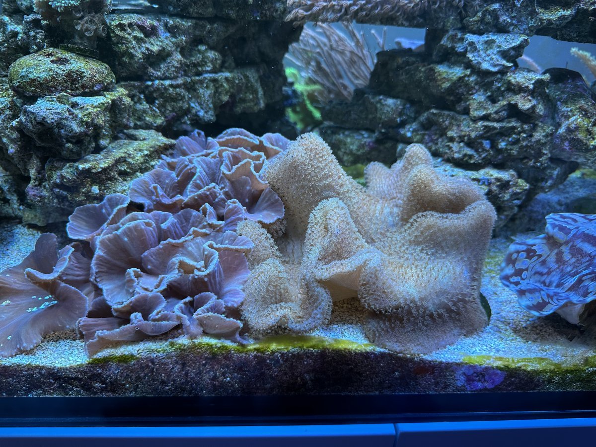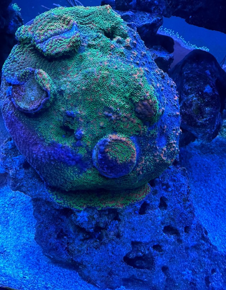 Strawberry shortcake leather from Divers Den. 10” x 10” x 6”. Very unique. Covered in dense soft polyps. Has unique green flesh and pink polyps. - Sold