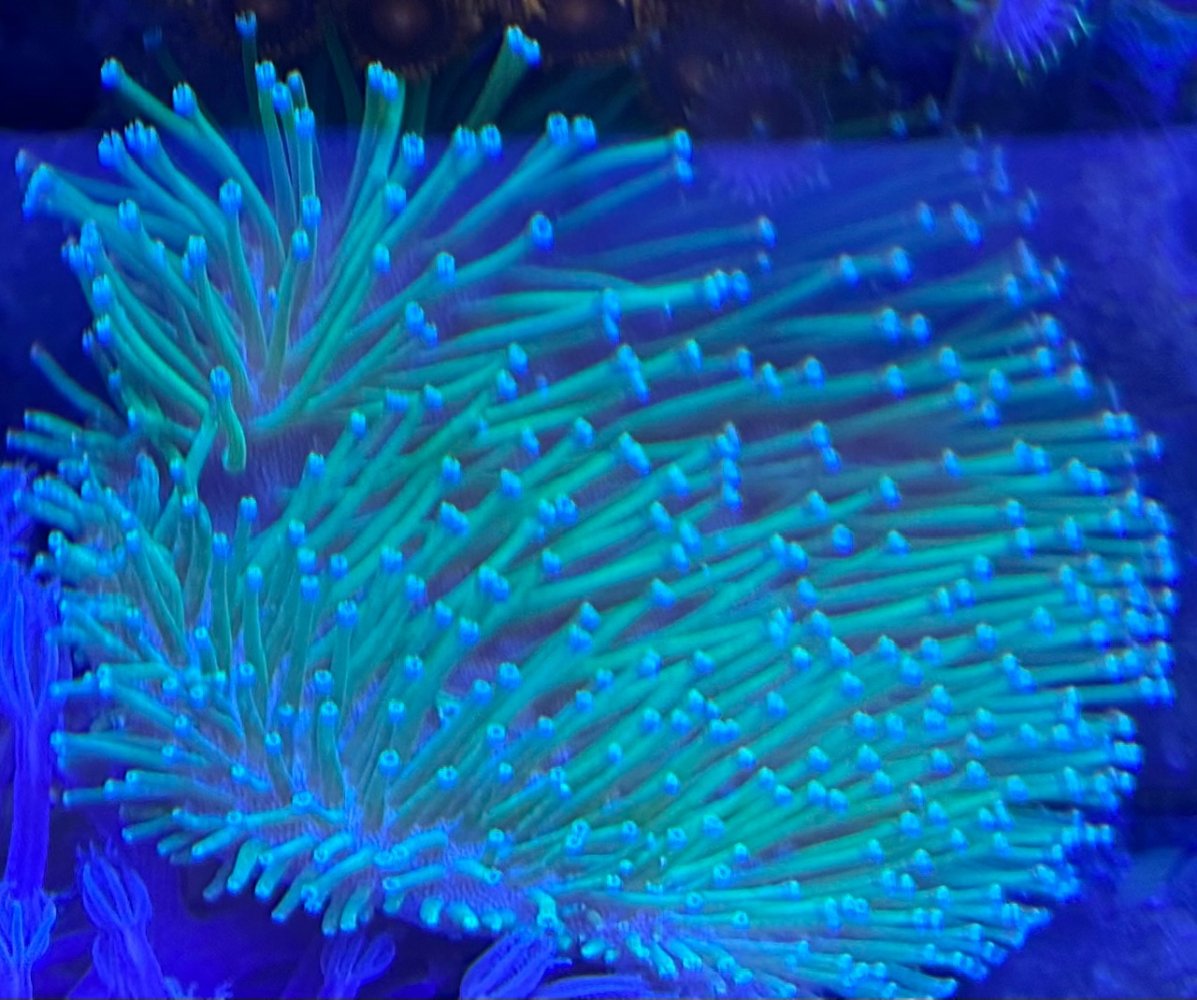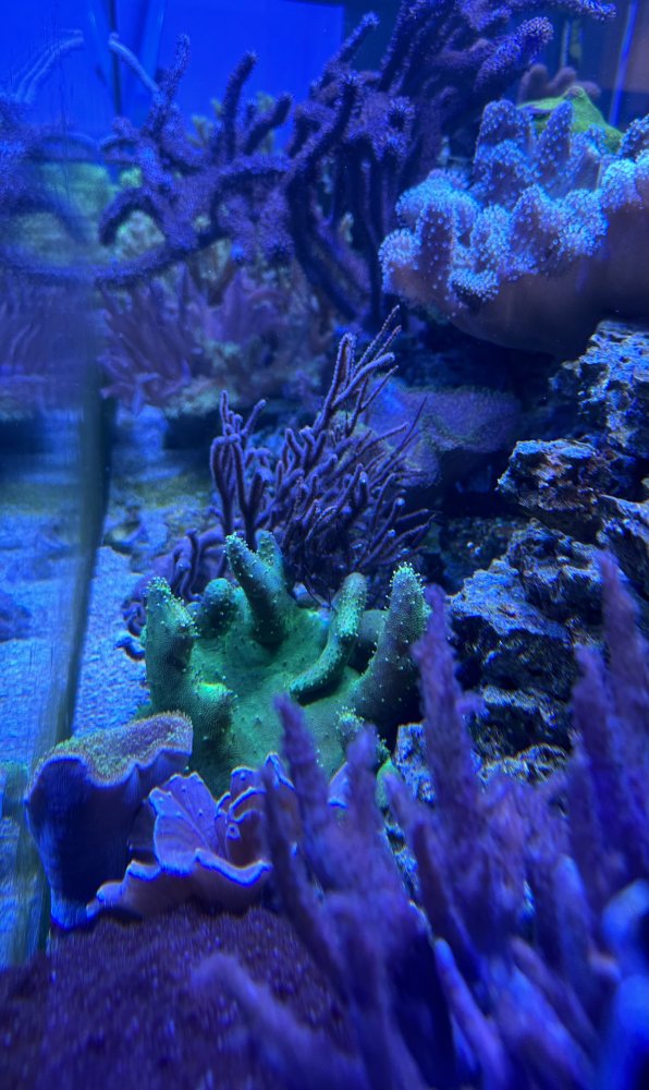 Bright neon green cabbage coral from Marinefarmers. 3” x 3”. Very slow grower. - Sold