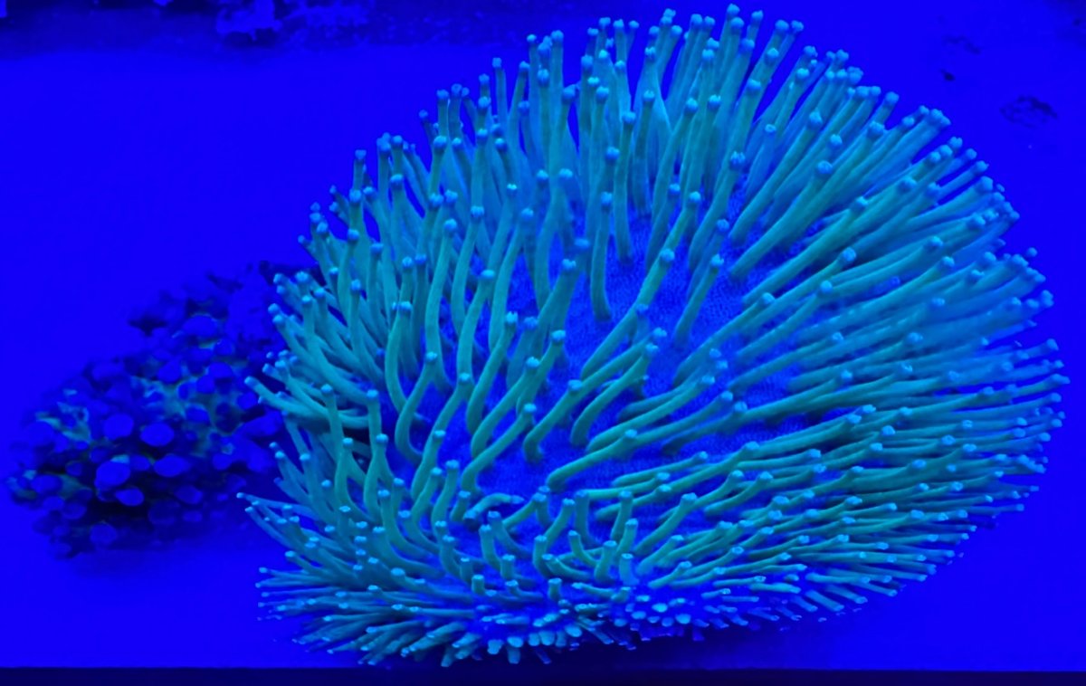 White polyp devils hand parents and frags from Dong. This self frags. Have lots of frags. This is located to the right of the neon green sinularia on the top shelf. Coloration under low light is pink with white polyps. - Frags free to members. Also have free loose frags of green skirt zoanthids or Pandora zoanthids. Could be either… - Sold