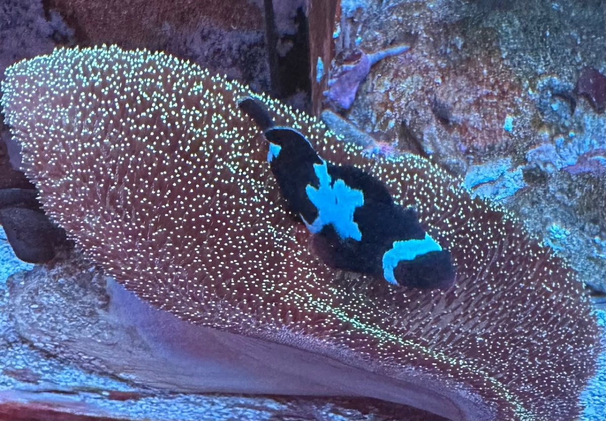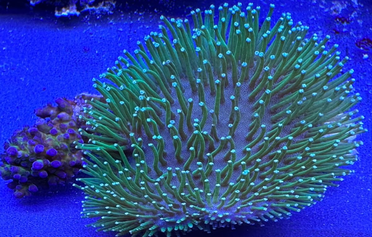 Neon green fiber optic toadstool from Aquacorals. The clowns sometimes like to lay on top of this when the other fish aren’t nearby. 6” x 6” x 3” - Sold