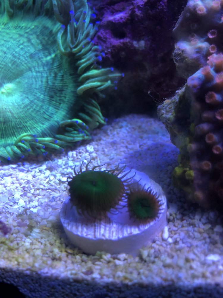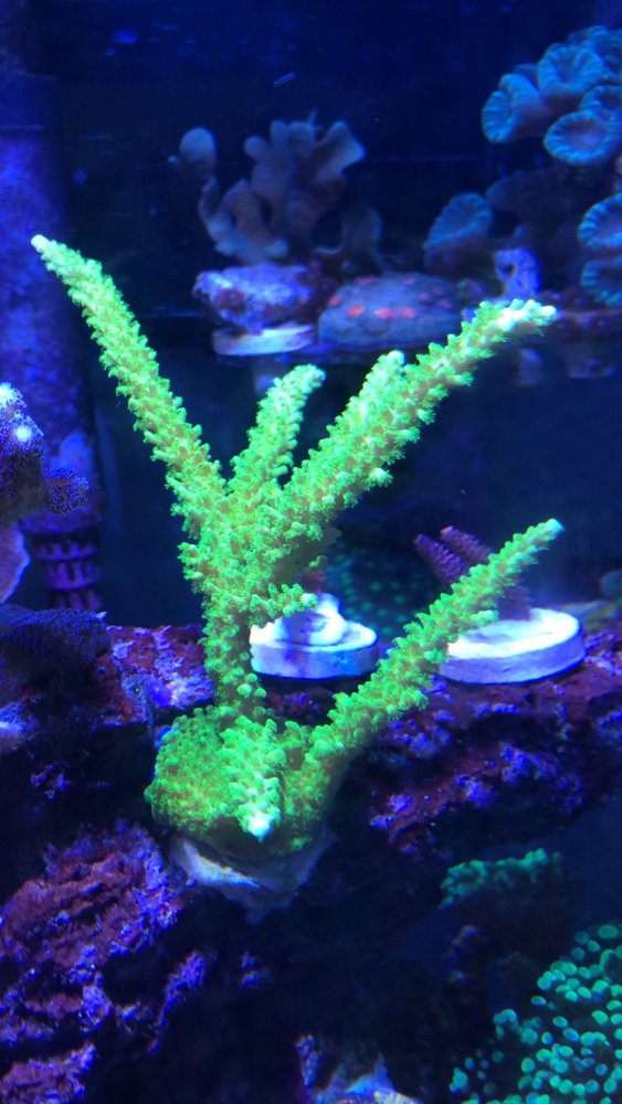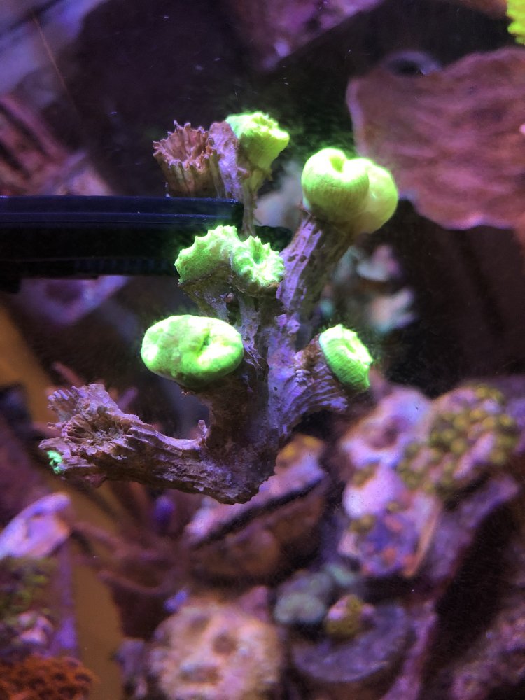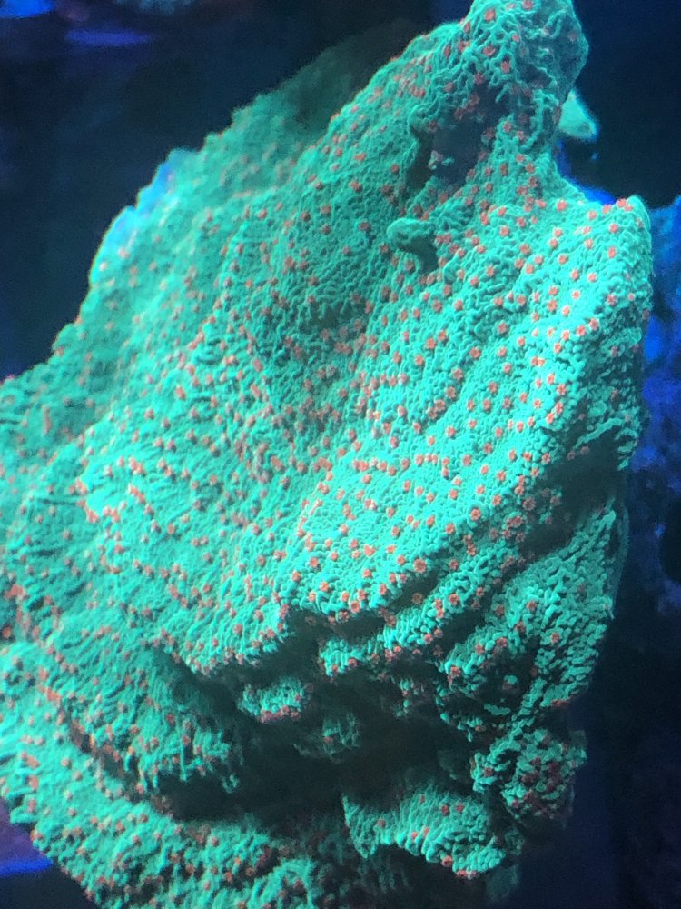 $40Large mushroom rock – probably about 10 mushrooms on it, green spotted – they will color up more with direct light. The rock has been shaded for a few months.SOLD$25Red montipora plate: 4-5 inches in diameterSOLD$40Tyree seasons greeting montipora plate: 4-5 inches in diameter, thick plate-SOLD$10Nuclear death palys-SOLD$20Green ring palys and mushroomSOLD$25Toxic trumpet, 8-9 headsSOLD$40Teal Blue trumpet, ~14 headsSOLD$25Meteor shower cyphastrea – fully encrusted plugSOLD$45Green bali slimer SPS colony, probably 4-5 inchesSOLD