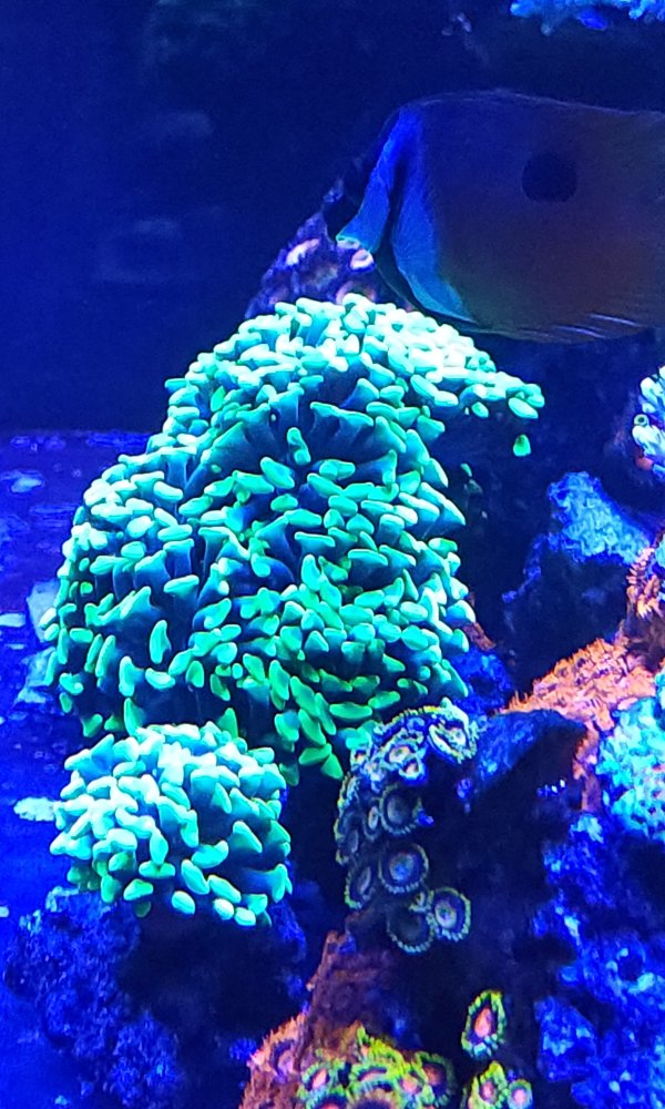 Nice shot of my wife’s seahorse tank with spaz the green clown goby hosting the neon green sinularia and part of the herd. How many seahorses can you spot?