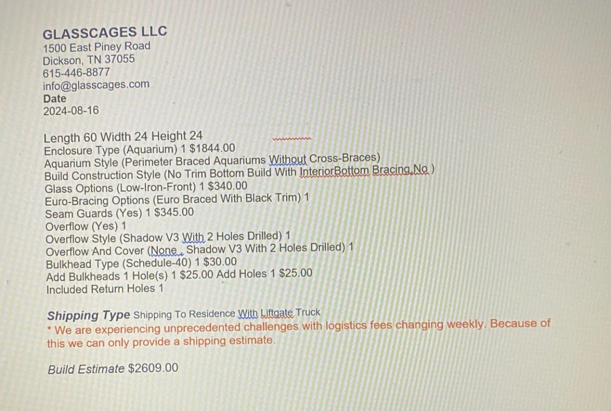 The tank is coming from @All Things Aquatic. Hopefully be here by fall.(need to refinish floors first) It's going to be a Planet Aquarium tank. The dimensions are 60x24x24. I'm thinking of a shadow overflow center for Bean animal drainage with Euro bracing.