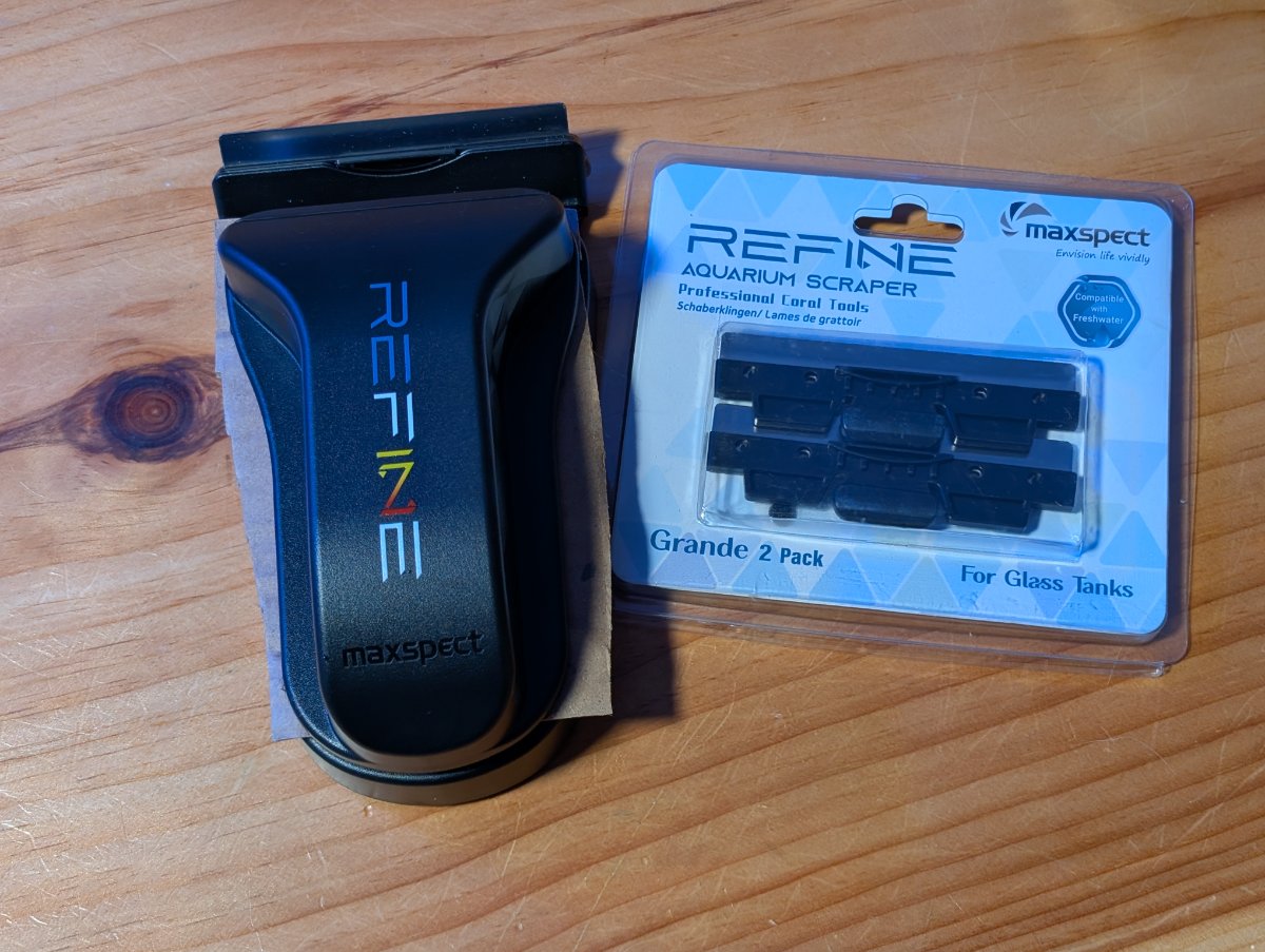 Selling a brand new opened box Grande sized Maxspect refine algae scraper with built-in wet stone, come with a set of two stainless replacement blades and a set of replacement glide feet. $100 firm.