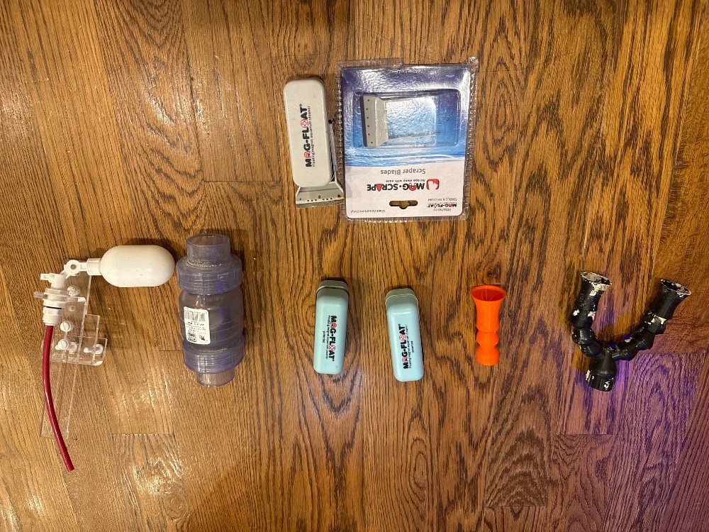 1) dual random flow $ 20 2) single random flow $5 3) mag-float $10 4) mag flat $10 5) check valve $20 6) gravity fed ato valve $5 7) magfloat with scraper $20