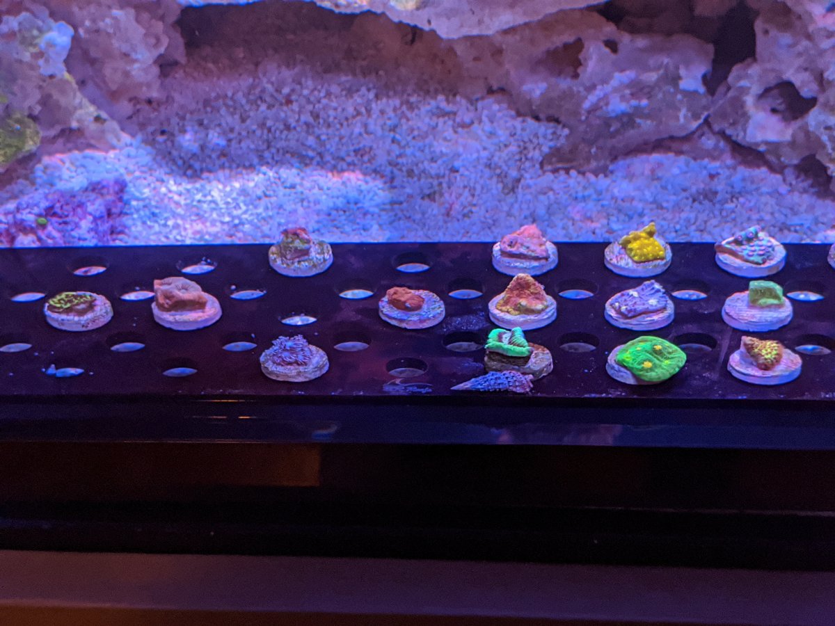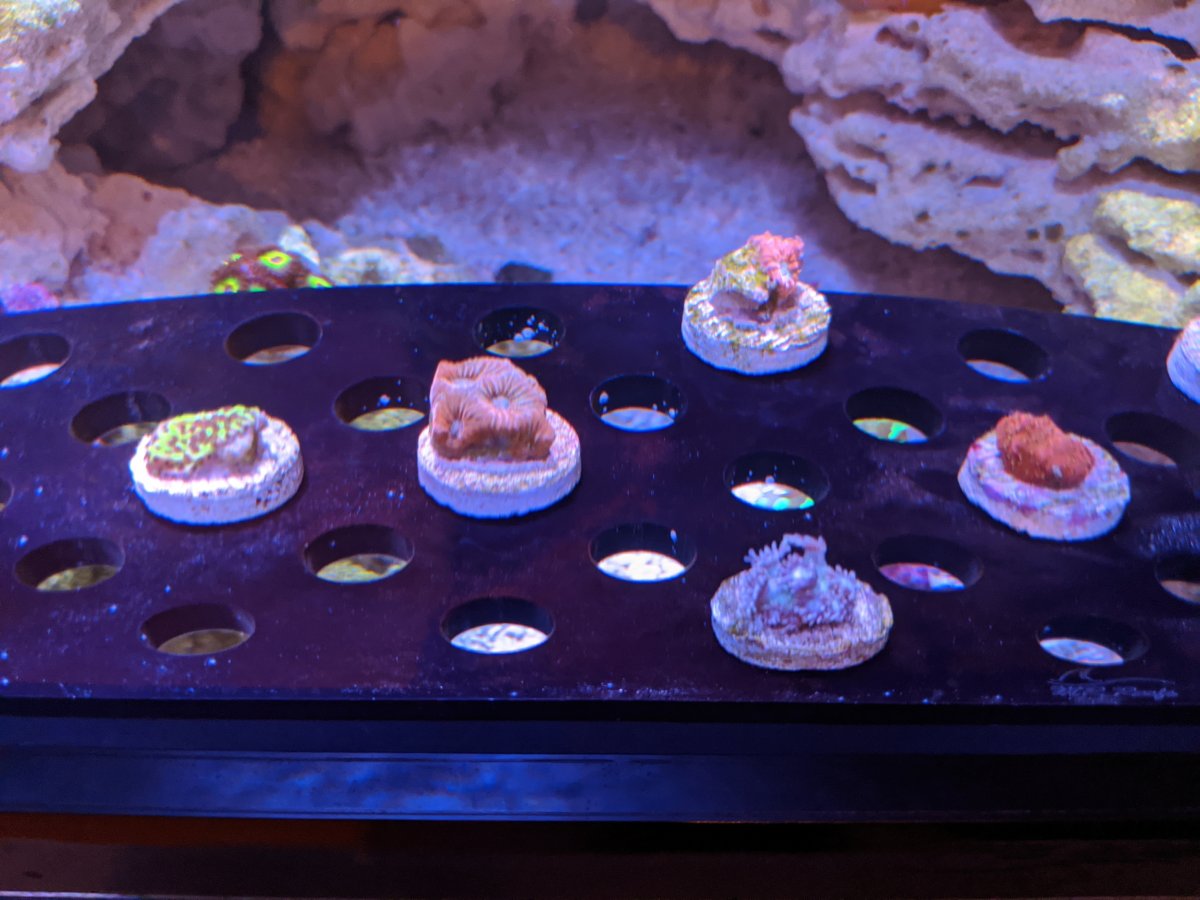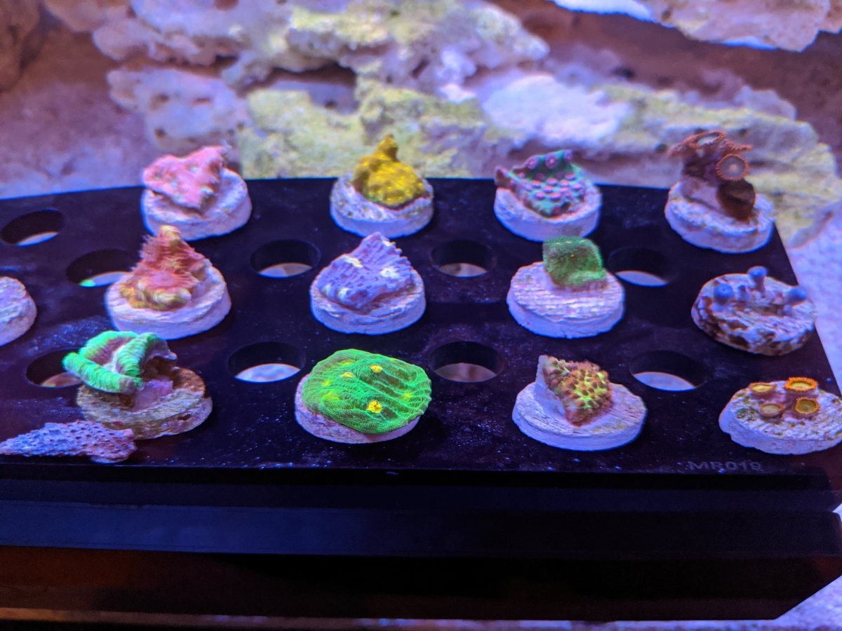 Everything is on the frag rack, which has been moved down near the sand. Everything is mostly open (I've moved the rack a couple times so they are still a little mad).