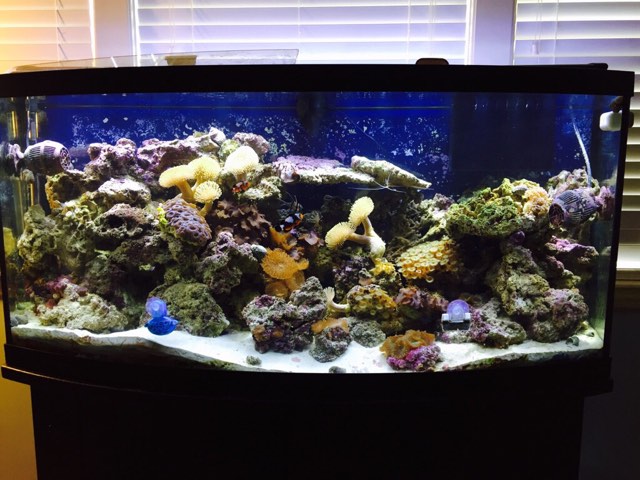 I have a mated pair of clowns, not sure the exact type (snowflake possibly) Kole tang, Banggai Cardinal,emerald crab, sea hare,cleaner shrimp, turbo snails and narssarius. Also a yellow cucumber in the process of splitting.