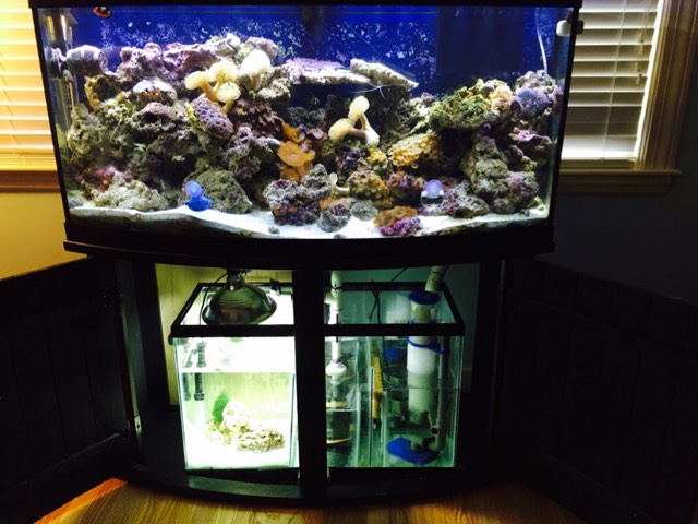 I just finished the sump yesterday. It has an eshopps 800 overflow box- psk-75 in sump protein skimmer-sicce 2.0 return pump. I bought a 6500k light from lowes for the refugium. The overflow was a little strong for the return so I had to dial back the overflow line a little.