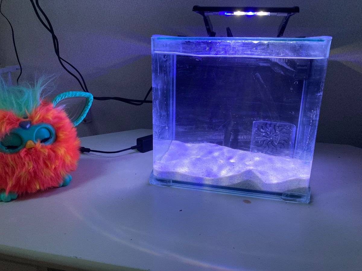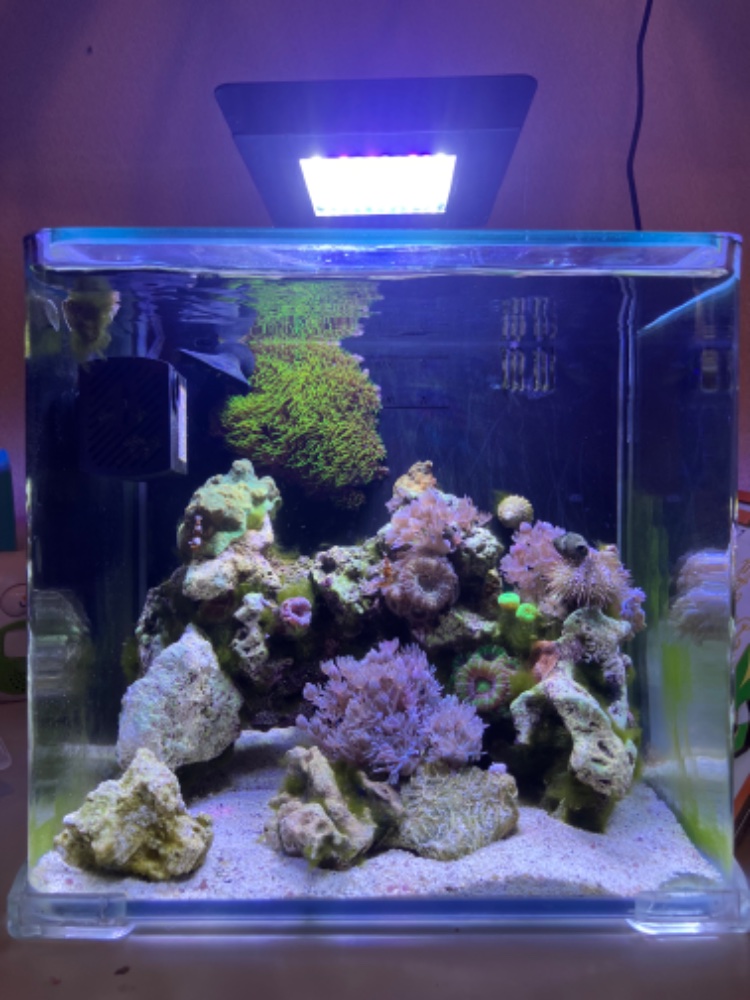 After putting in the corals I added my freshwater Hygger light and placed on full power. Still using salt mixed with softened well water. Changing a quart every few days.