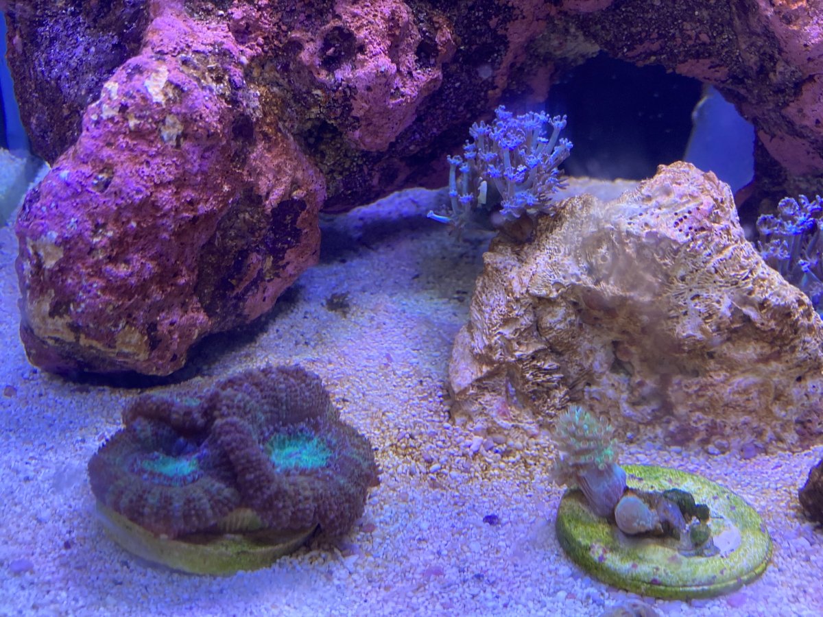 Things are looking good for coral health. Inverts seem good. Got something that looks like Dino’s or cyano that covers front of sand bed during day. Some over a couple of rocks. Then at night it’s gone from sand bed. Easy to brush off. My nutrients have occasionally bottomed out to undetectable for phosphates per Hannah and 2 for nitrates on Hannah and Salifert tests. Color is bright green to brown with some bubbles. Though bubbles are more from micro bubbles forming in overflow not having full siphon. Not sure if I should wait it out. The clean up crew will intermittently clean the rocks with the stuff. No losses of livestock. One year old now. Wait it out or get aggressive ? Keep with weekly 20% WC? I now have vermitids popping up. Will get bumblebees and superglue them one by one by removing rock and inspecting thoroughly. Adventures of reefing are a part time job.