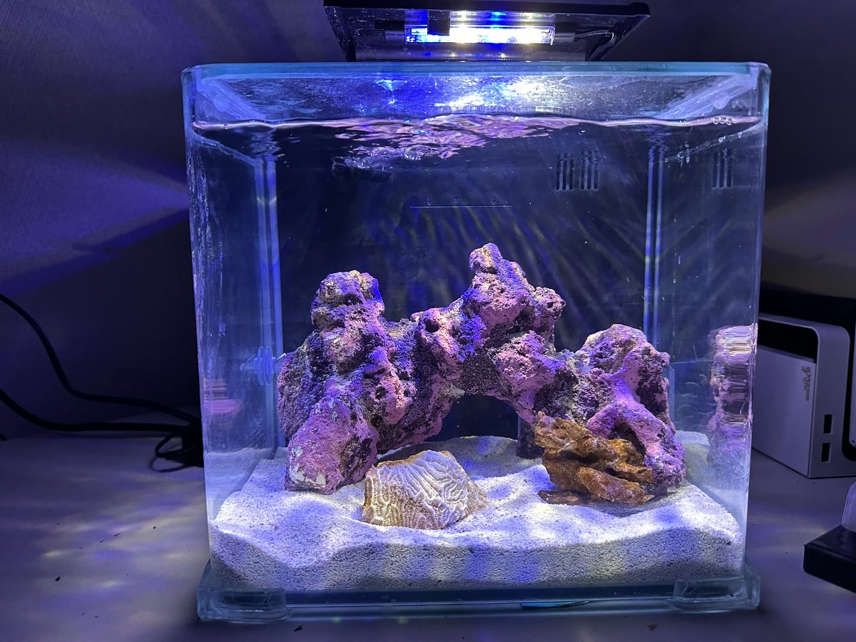 I found a Facebook Marketplace 2.5 g GloFish tank $10. Has an overflow, so basically an all in one. We got some Instant Ocean, Fiji Pink, and an arch from CaribSea. Used API bacteria, ghost feeding, cycled sponge and bag of ceramic media from my freshwater tank to help it along. Used well water (TDS 500, Calcium above normal, PH 8.0 no nitrates or ammonia - data from a drinking water lab). Fed it cube of mysis and freshwater pellets. Cycled in 2 weeks. Then we picked up 2 small live rocks from All Things Aquatic. These were chock full of copepods and amphipods.