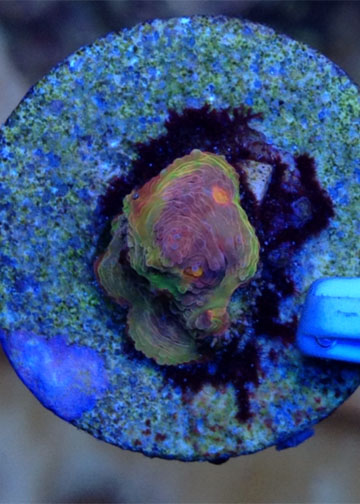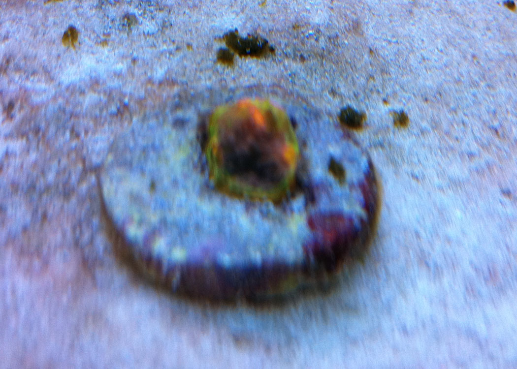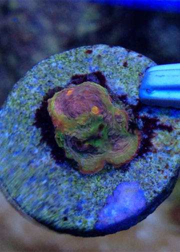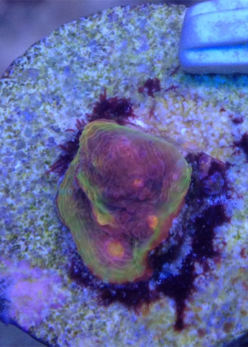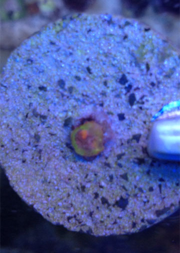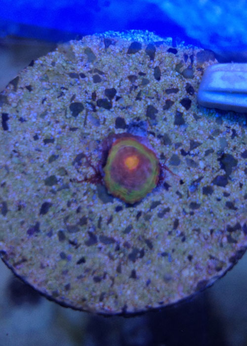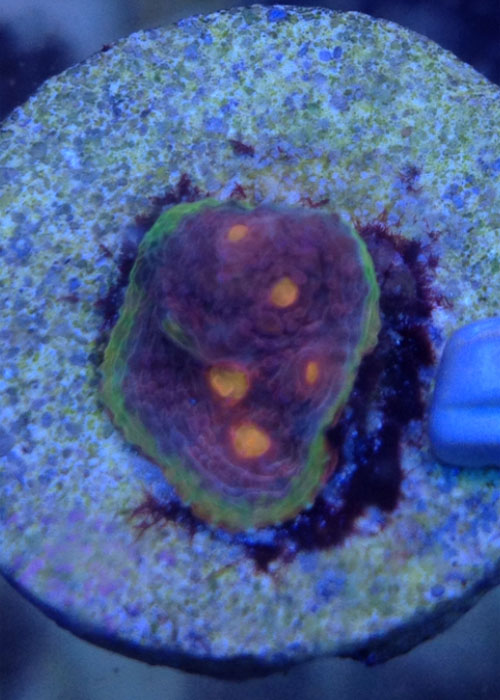 Ok so 9 months ago I picked up this one eye frag. At the 5 month mark we had enough eyes for everyone in the grow out. Are plan was to wait for more growth so each eye had a decent amount of flesh around it before fragging. We will frag the chalice soon. I had an issue where it looked as if it was being stung with a few very small areas showing white. I moved the chalice and it recouped great but it grew in green. Kind of odd I think. Here are some photos that I took earlier. Ill post more photos after I frag it.