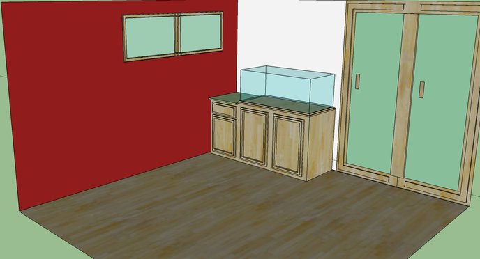Here's another drawing done on sketch-up that gives a bit of an idea on what the location is like... 2 full sized glass sliding doors in the same room, as well as multiple windows provide lots of natural sunlight, which i think will make the tank look cool, and maybe possibly add a bit of extra light...