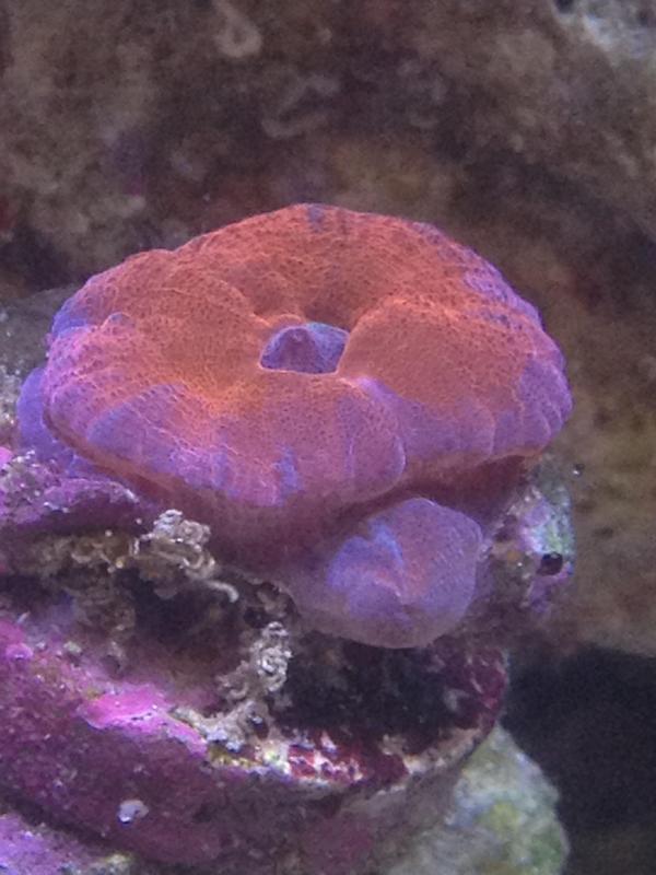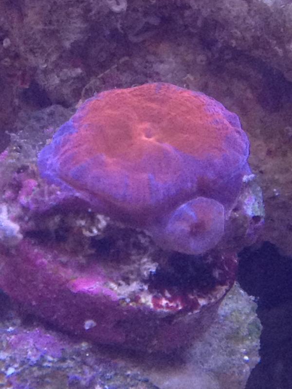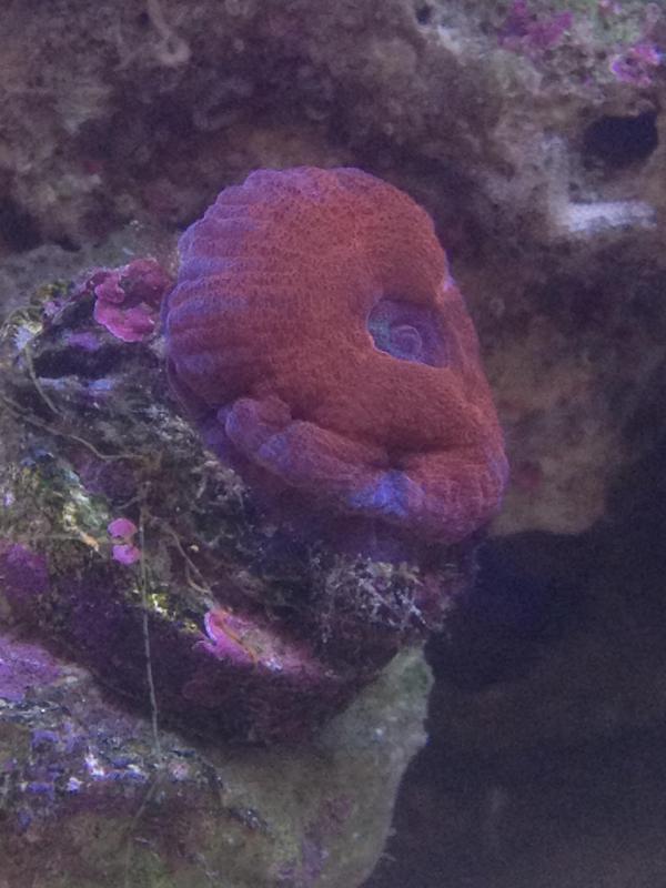 A few months ago I picked up this frag from a LFS for $5.00 because no one there seemed to know what it was. One of the girls there said that it was a "Red Puffy Blue Striped Acan". After goggling it and looking around since I got it I still for the life of me can't figure out what the hell it is and now that it is starting to sprout new heads I am even more curious as to what is actually is so I can get an idea of what it will look like when it finally grows out into a colony. I showed the pictures to my buddy Kotu100 and he was thinking possibly some kind of closed brain or something like that. Please excuse the poor picture quality, they were all taken with my cellphone and a few of them I snapped during feeding time so I could get it in different stages. Thanks for the help guys!!!!