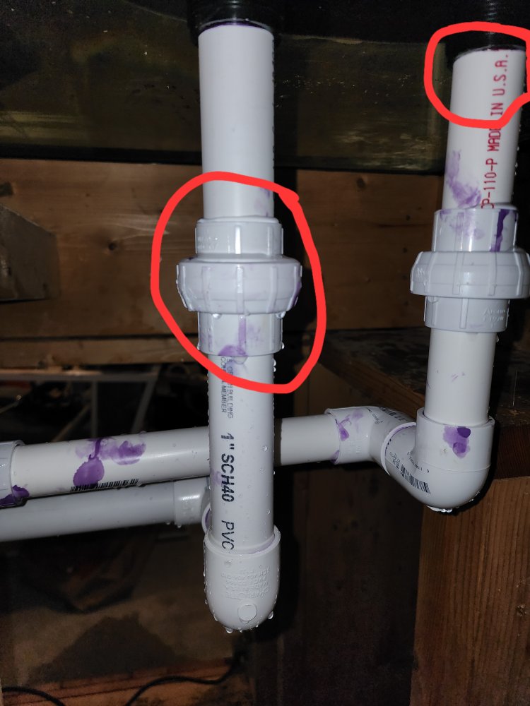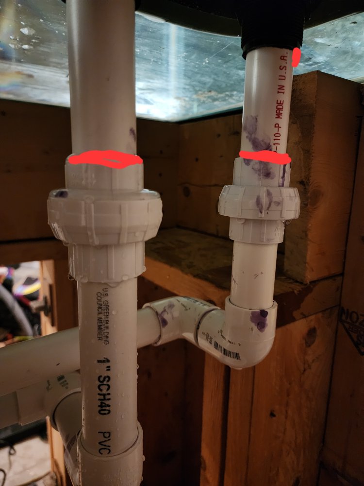 The one on the left is it coming from the union connection or the slip fitting? The one on the right there is not much you can do once it is cemented in place. They do make drill attachments to ream out pvc fittings but it would probably be cheaper to get a new bulkhead. What were you using for pvc primer and cement? When cementing pvc you need to prime both connections and then make sure when you cement the two they are firmly seated and give it a 1/4 turn to make sure the cement has full coverage.