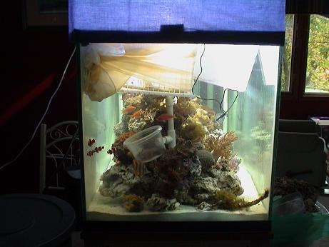 The egcrate at the top has some mesh in it and is being used as a holding tank for fish that I'm getting rid of and as a temporary place to keep my macro alge. The tupperware has some small frags that I need to find a place for.