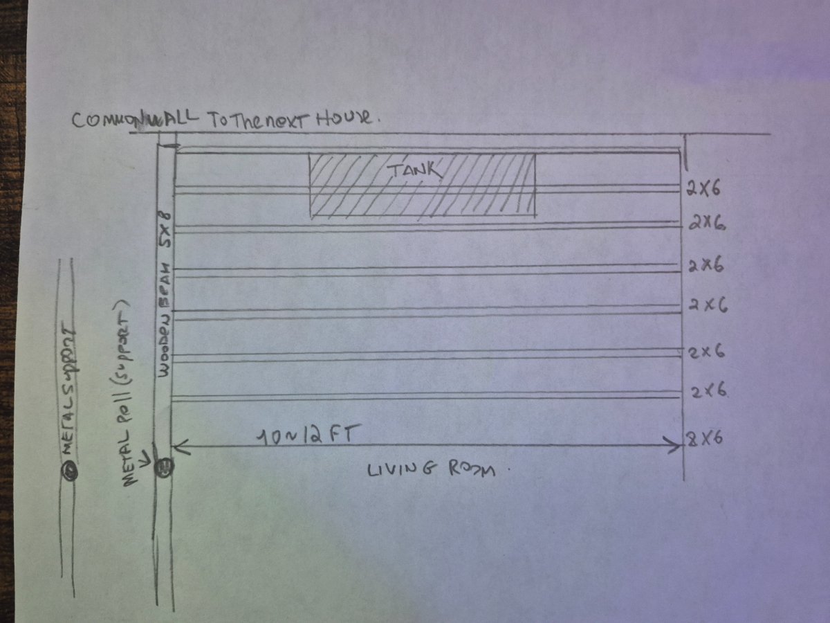 Hello there, I am looking to get a 80 gallon tank in my living room which is above a finished basement in a wooden framed townhouse. The house was built around 1982. I am not sure about how far apart the joists are but doing some research online it seems that the going equation is 40 lbs of weight per ft sq. The tank is 48"x 24" or 8sq ft footprint which would result in a max load 320 lbs of weight. So the question is besides will my floor be able to support roughly 850 lbs at what tank size do you start thinking about reinforcing the joist below in the basement?