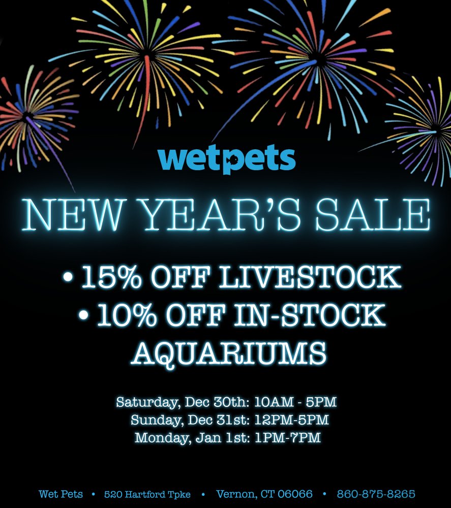 New Years sale this weekend. Saturday 10-5 Sunday 12-5 Monday 1-7 15% Off Livestock 10% Off all in stock aquariums Hope to see you. Feel free to comment or message us with any questions.