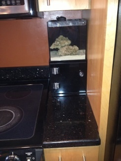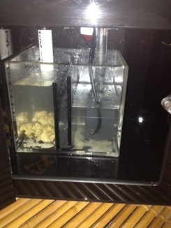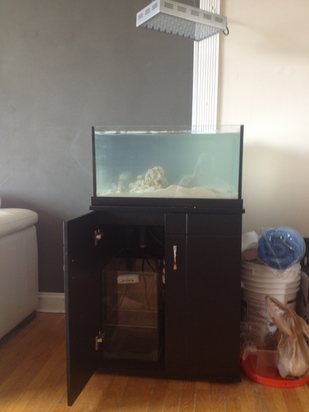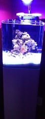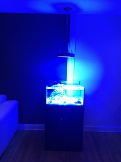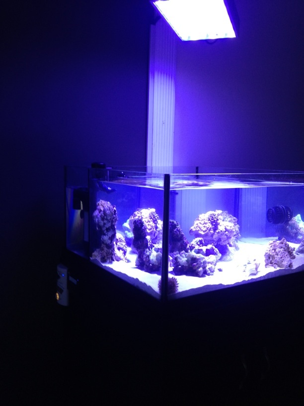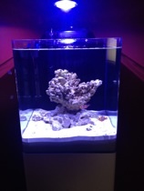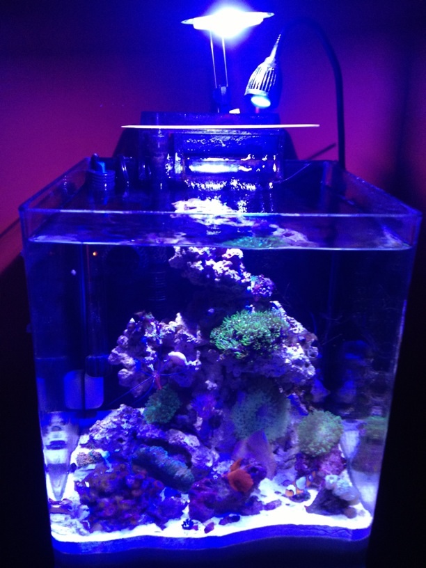 Lastly I have a custom 1 gallon cube w/oveflow intake and return on custom stand with 3/4 gallon sump. It's been running for 3 weeks now. I'm running a rio 400 return pump. Has a few lbs of live sand and live rock and two small hermit crabs. I need lighting ideas as I just have a small led light on it. The tank is almost cycled so not sure what to put in it.