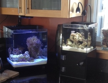 I also have a 8 gallon Jalli cube on custom white stand running for about 3 weeks with a clown and a mandarin goby, and one really small hermit crab. Has about 10lbs of live sand and 12 lbs of live rock. Tank has HOB filter (Fluval C3 soon to get IPES Aquatop filter with UV and skimmer), heater, hydor 425 gph wave maker, and an eheim 50/50 led. Tank is almost cycled.
