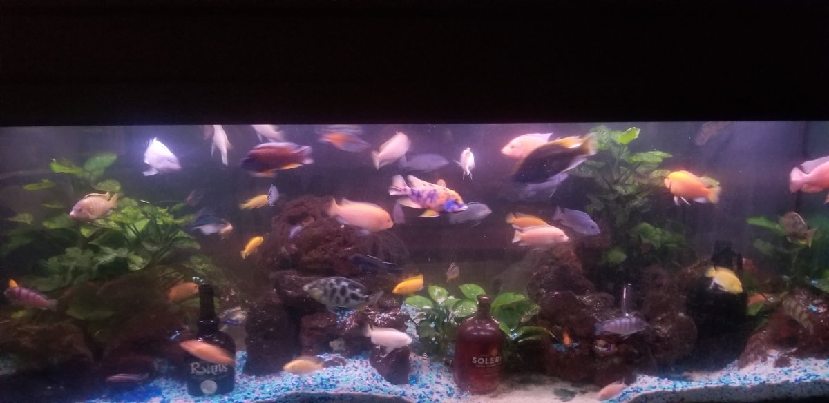 Welcome! Nice collection of cichlids. I didn't know that people dose irish cream liquor to freshwater tanks like how we do vodka for the saltwater. ;) Those bottles give nice touch to the aquascape.