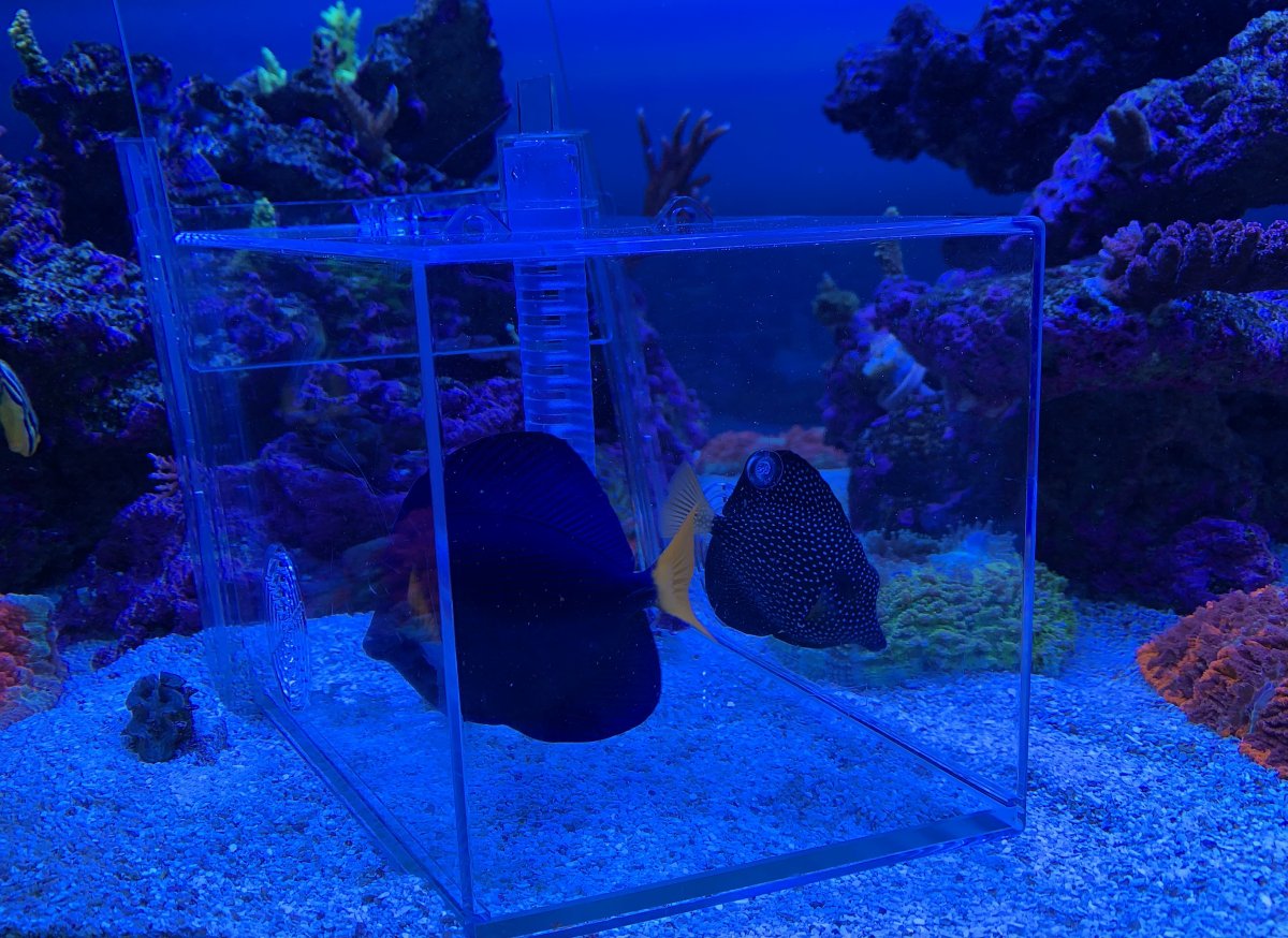 Woke up today and found the other jawfish conveniently dug and under the brain coral. I quickly grabbed a plastic container and jammed it under the sand with the jawfish. This war is over. They’re now in my other tank. Not sure what I want to do with them yet. They’re beautiful fish. Maybe I set up a 20L tank for them.