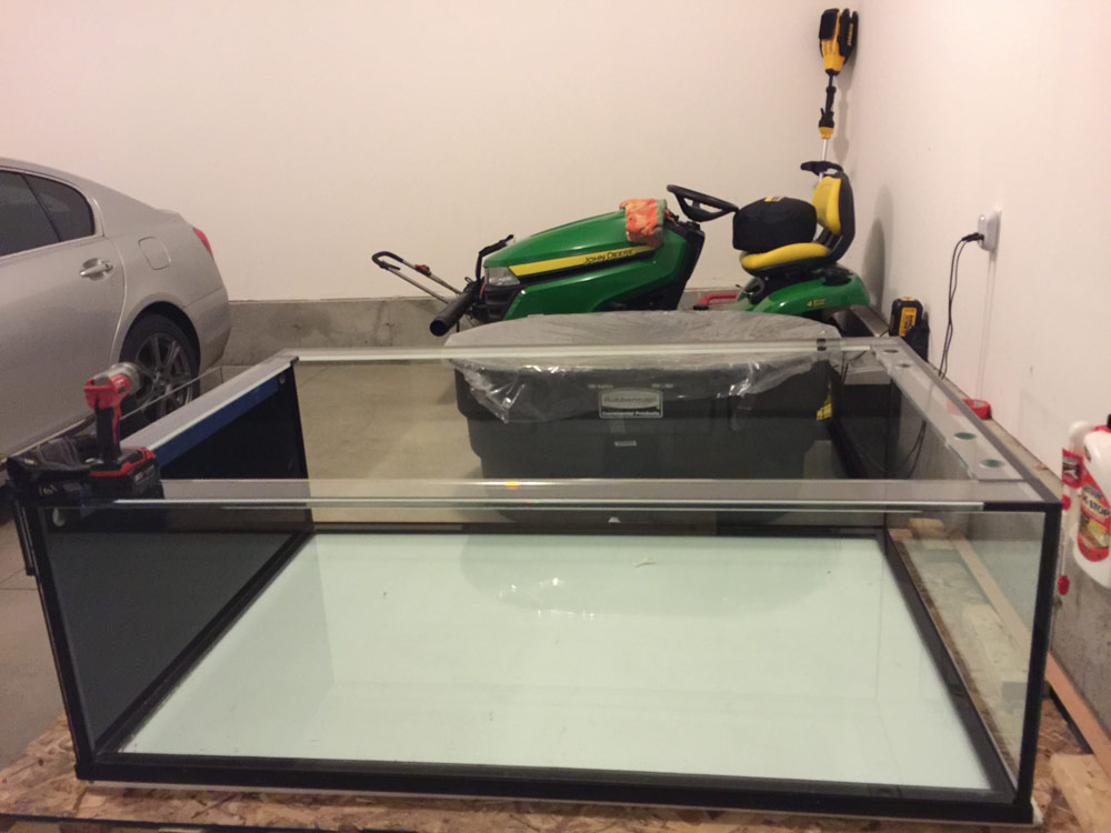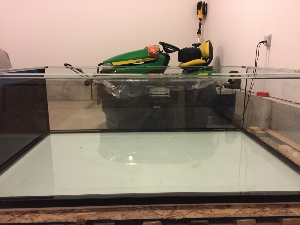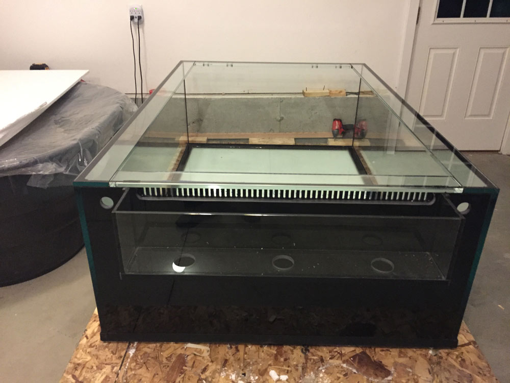 Congrats on the new tank... look great! I would put in concrete first due to the weight, your tank will be like 5k of weight. I afraid it might crack on tile : )