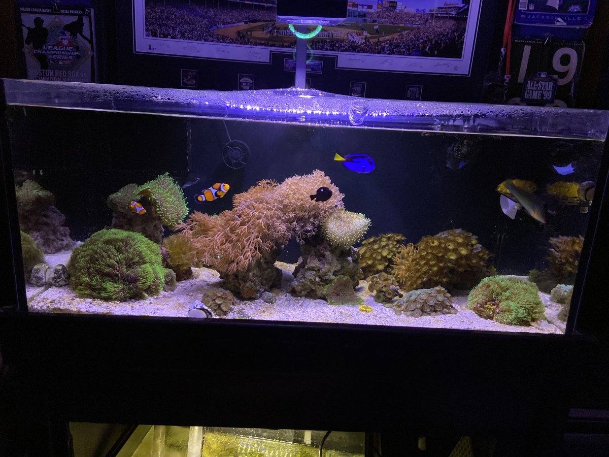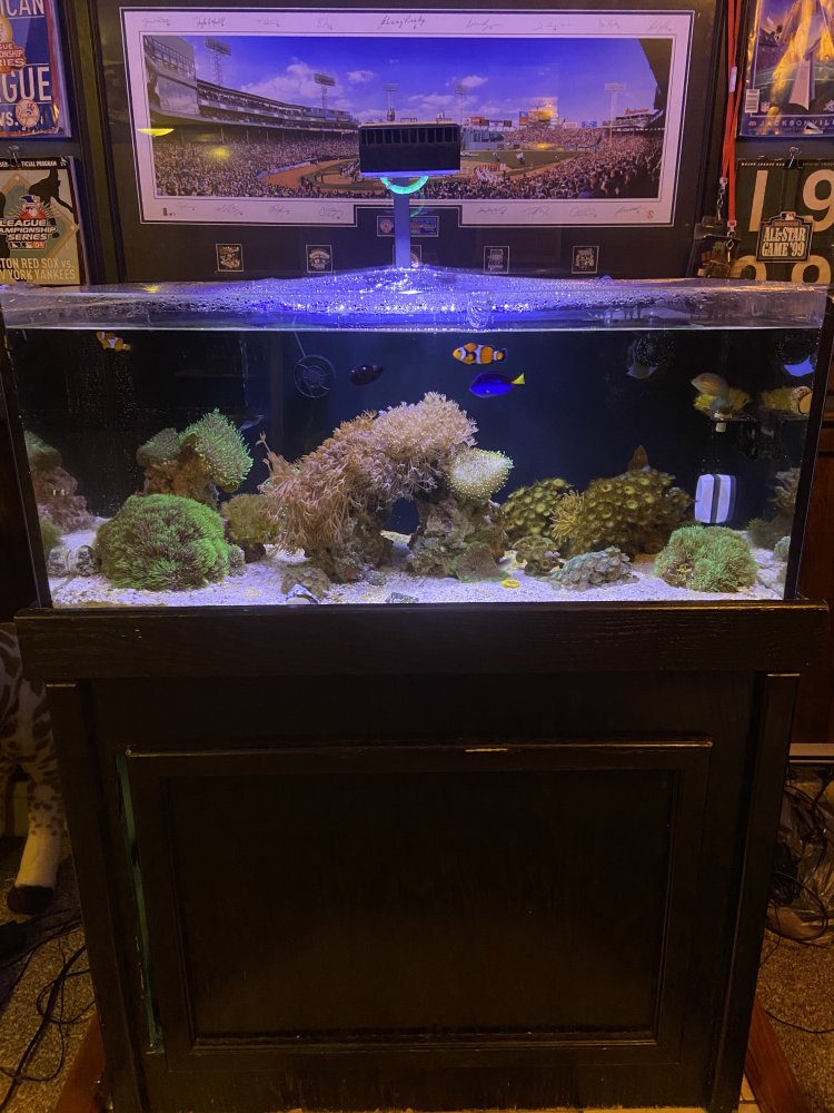 i recently have taken down my main display (40gallon with 15 gallon sump box lighting i believe, it is LED) i am moving soon and unfortunately cannot take it with me i also have a newish standard 40 breeder, the old main display has an eshopps overflow and is drilled with a stand the tank its self is not in perfect condition the black back is chipping and there is a chip on the rim but it has zero issues holding water and the chip on the rim is not a cause for concern for breaking