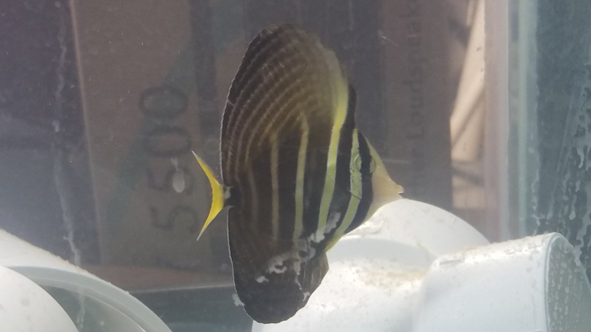 I bought a desjardini sailfin tang yesterday from a local fish store, sight unseen because of the coronavirus pandemic (they had curbside pickup only). The fish was double bagged and then in a black plastic bag when handed to me in the parking lot, so I was not able to get a good look at it until I got home. It looks more like a Pacific Sailfin to me. I know they are similar in appearance when young, but I believe the tail on the desjardini are not yellow. Can anyone identify this as either Pacific or Desjardini? Apologies for the crappy phone pics. the fish is in my QT tank and the outside glass was not cleaned.