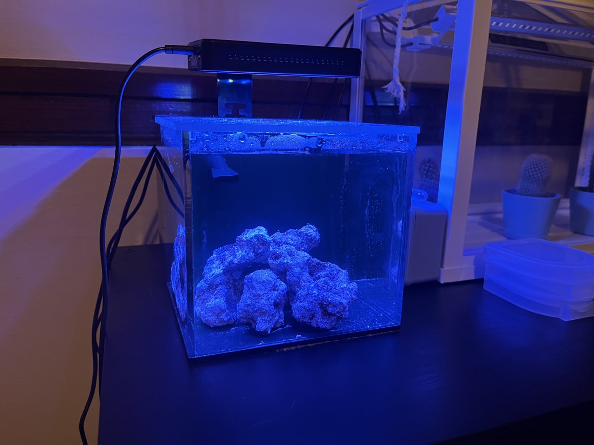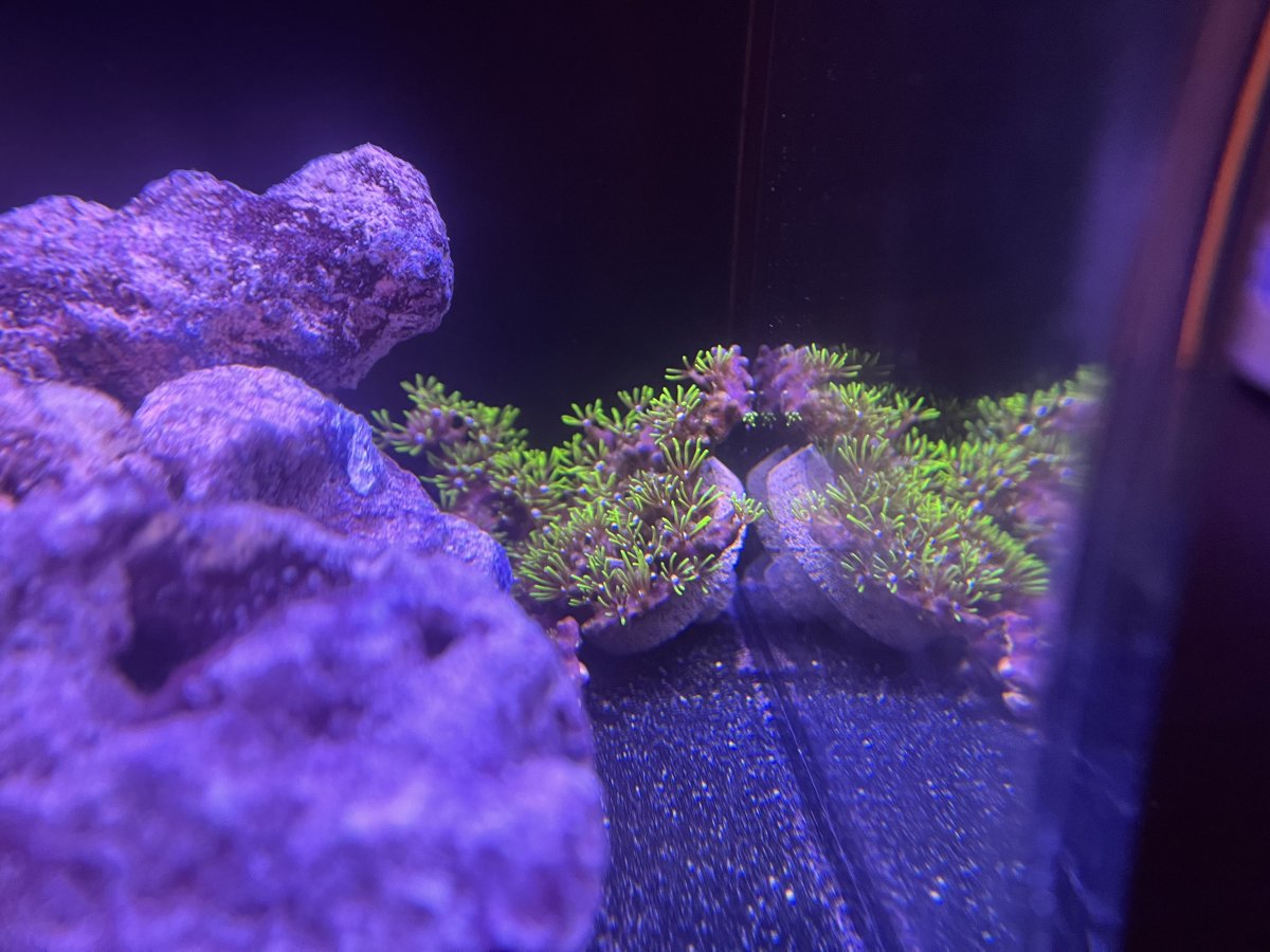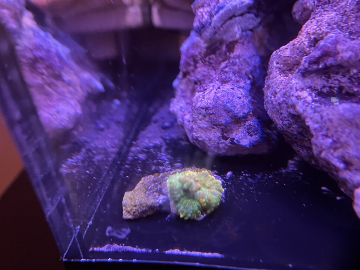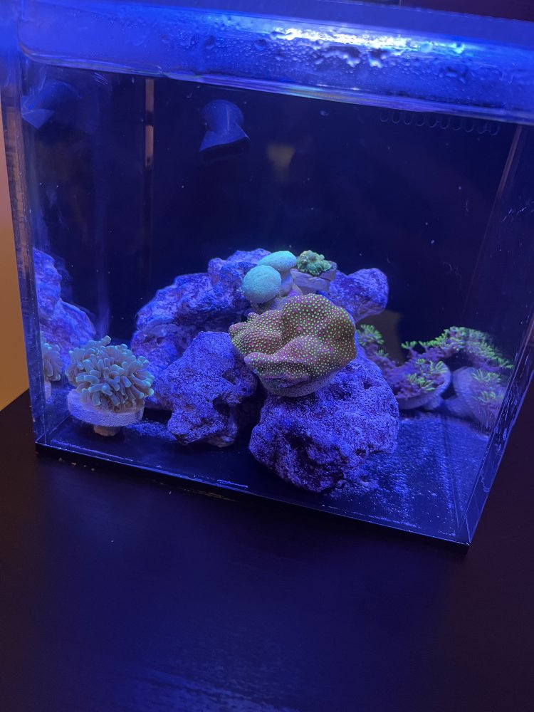 I started adding frags to a 1 gallon pico tank about month ago! Taking it slow with the understanding that teeny tiny tanks are tough. (I used to have a 40 gal before I had to break it down for a move) So far things are going great, I’m starting to get growth on the few frags I have in there. Keeping it as simple as possible! I just added an ATO and rearranged to get the small hammer frag out of the flow, where it seems to be doing much better. Looking forward to meeting more people in the group!