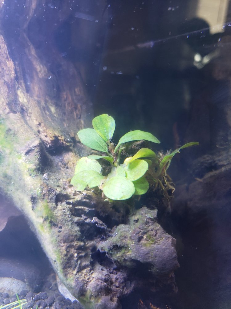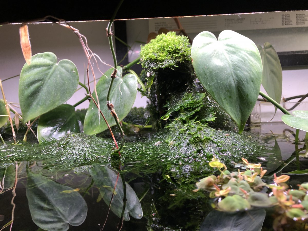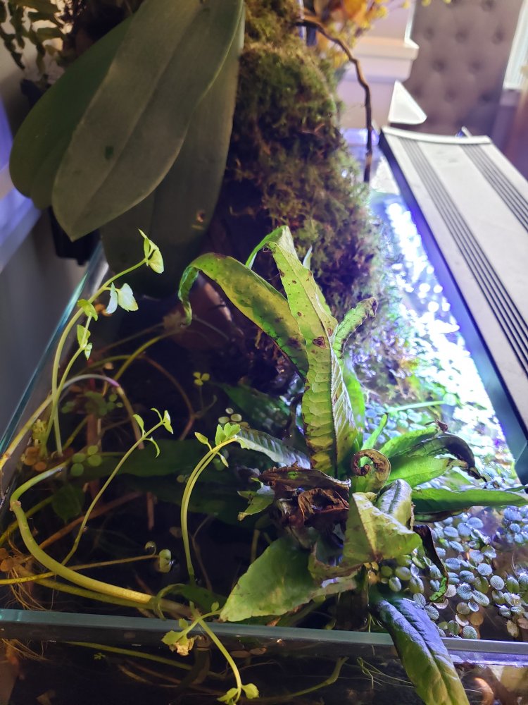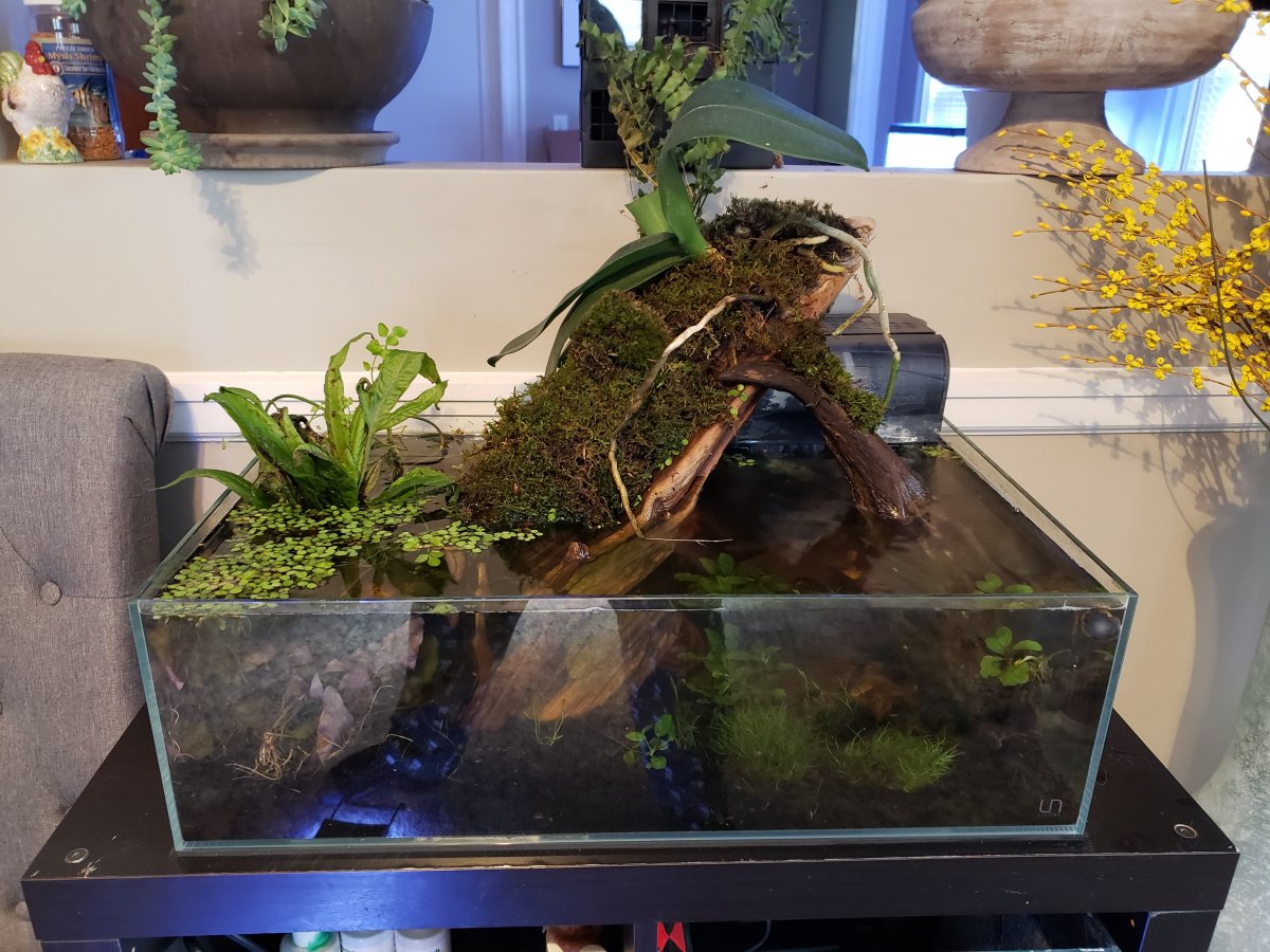 -2 logs creating an arch that is half out of the water. One of the logs is much larger than the other but both have terrestrial moss growing on them in and out of the water. The smaller log has about 12 leaves of a Bucephalandra sp. specimen I'm trying to root to it and the larger one has a single Phalaenopsis sp. (Moth Orchid) I'm training to root around the log.
