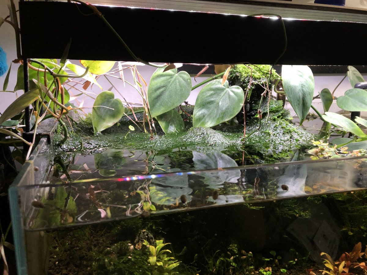 I've been playing around with filtration to get the right mix between flow for the plants, fish and settling debris so I apologize for the debris in the pictures but my current, as of today, filtration setup is seeming to be promising. I believe I've finally beat the battle against hair algae too, which has been quite satisfying. Since all of the light demanding plants are in the foreground I have a cheap LED fixture I got at Petco going over 1/4 of the tank but I am looking to upgrade this to a hanging pendant that will also reach the terrestrial section.