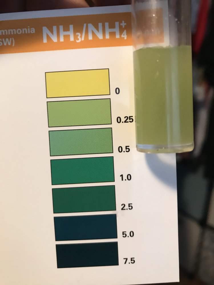 So...my ammonia test kit has about 10 different colors representing differing levels of toxicity, but the first two are supposed to represent 0 and .25...now 0 would obviously be ok...but .25 is deadly. From my eyes, mine seems to be somewhere in the middle, but I can't really decide.