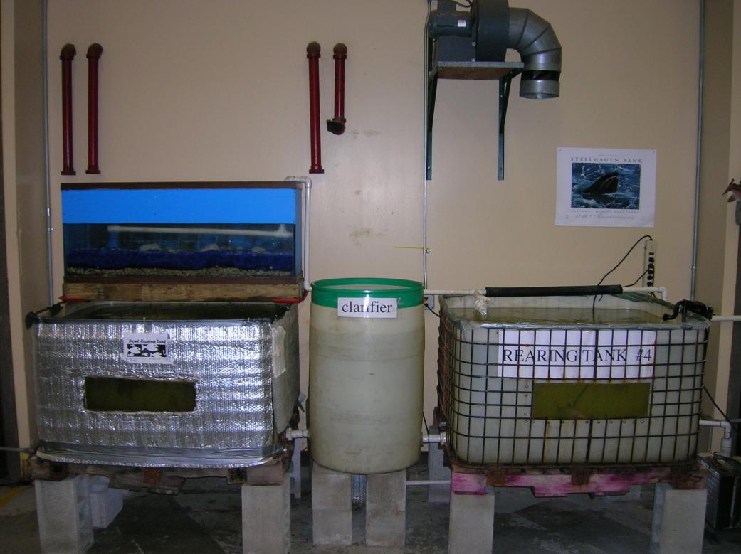 The dual 300 gallon polyethylene tanks with 3/4 HP Chiller and bioball tower with supplemental bead biofilter.