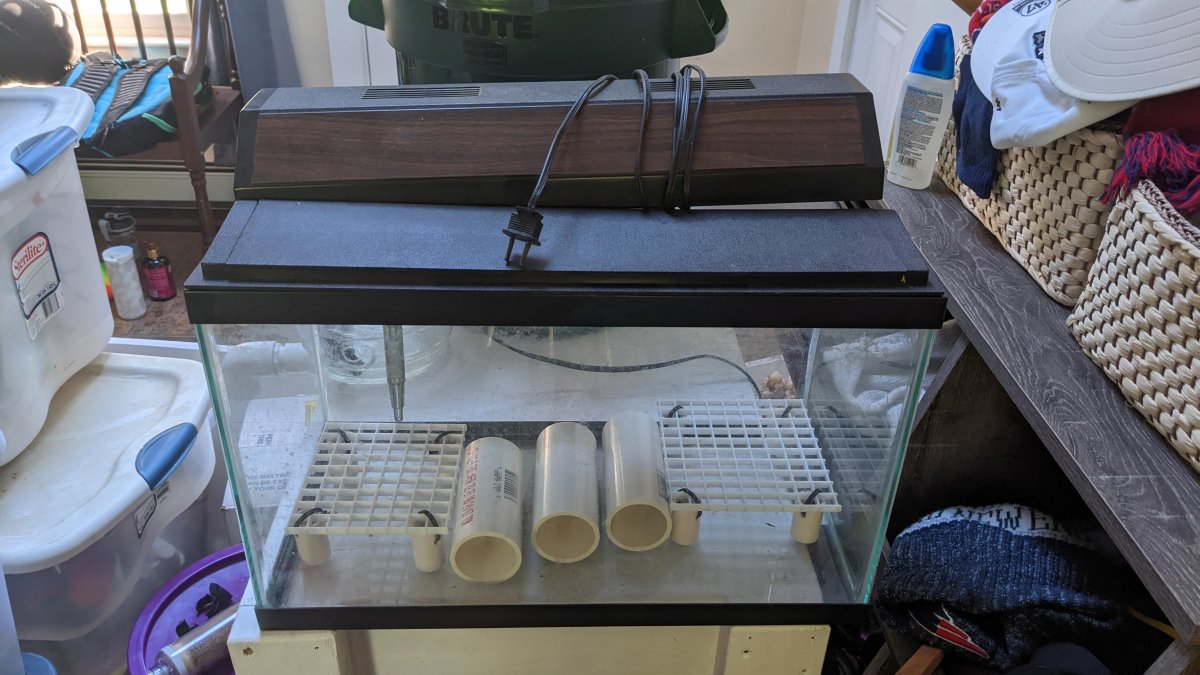 10gal tank with hood, filter, frag racks and pipes for hiding. Has had copper and other meds used in it. Located in Norton, MA Looking for $20.