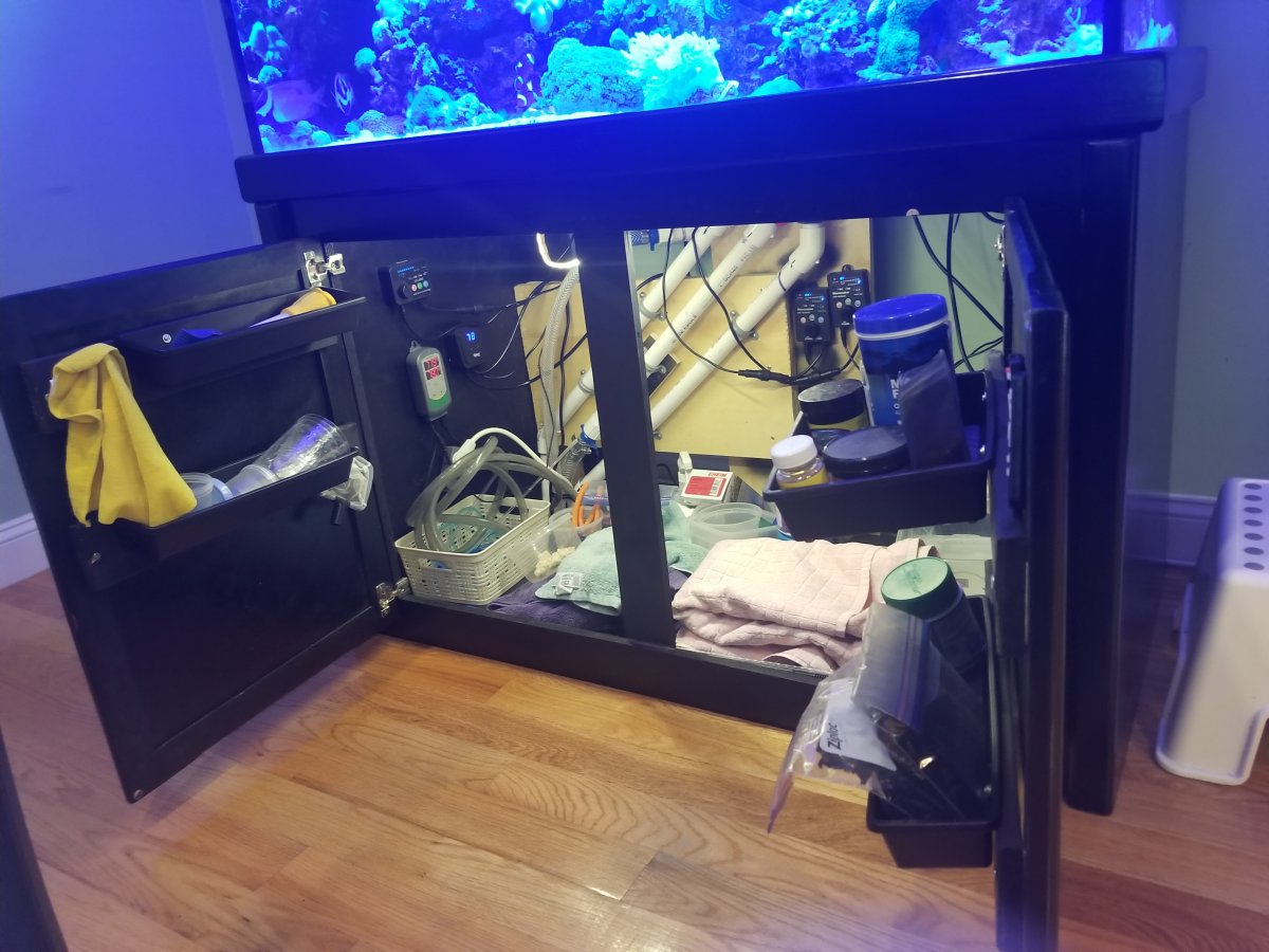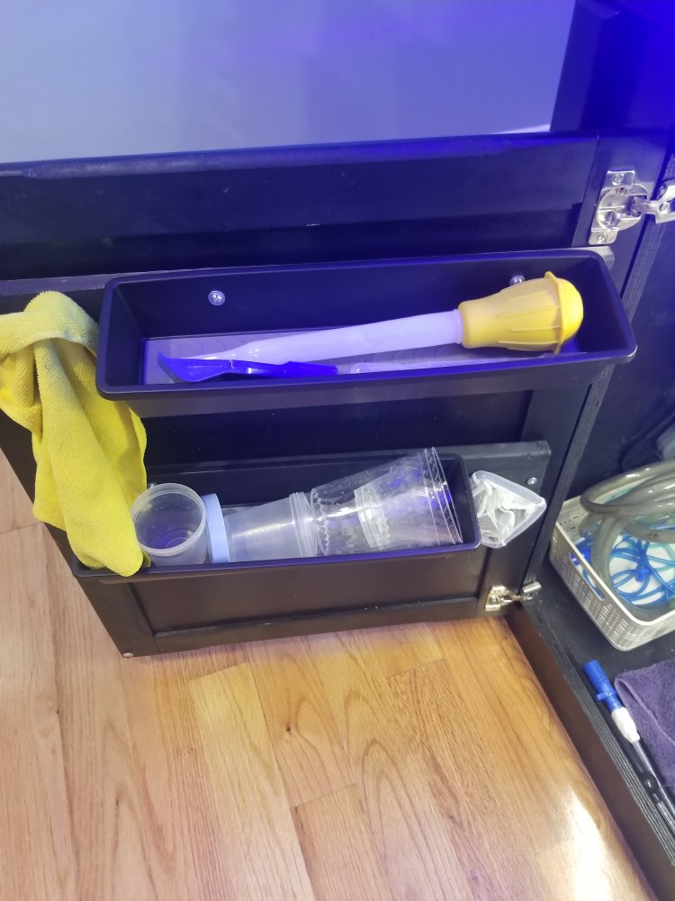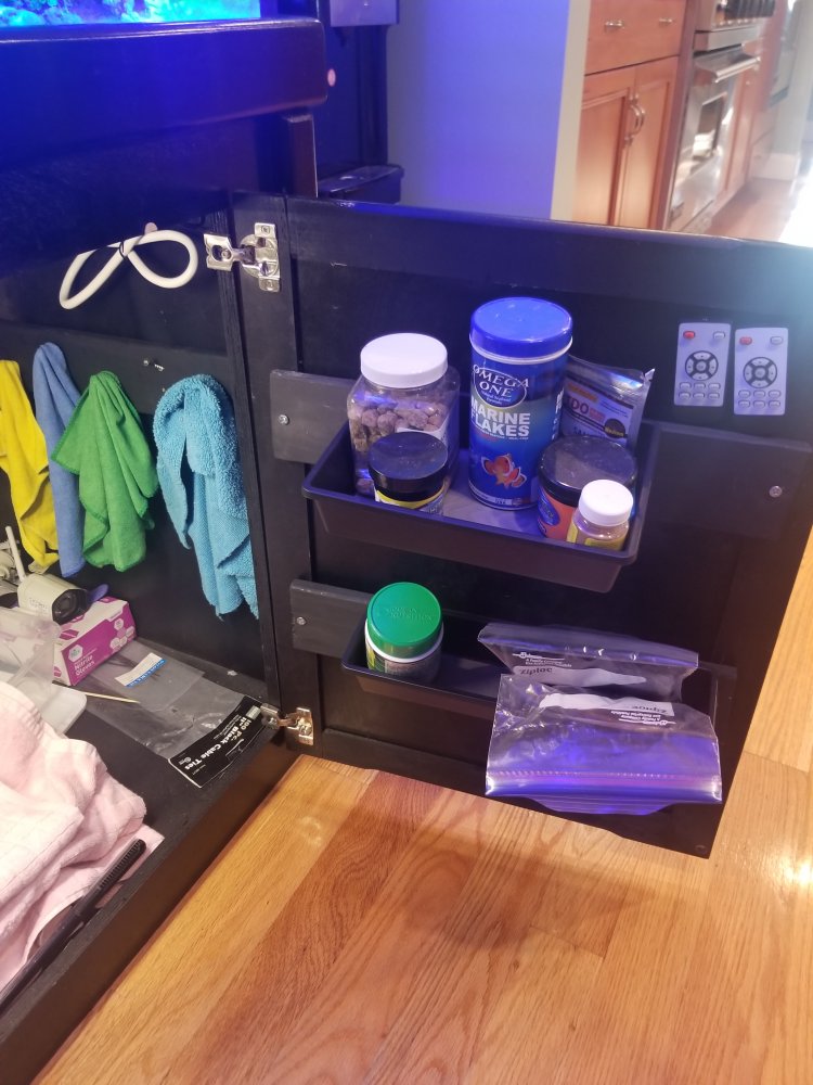 Cut some strapping (wood) spray painted it and mounted dollar store silverware organizers and stainless screws as hooks. Just make sure your doors can close and that the bins clear what in in your cabinet. I have a basement sump so space was not the issues, but organization was.