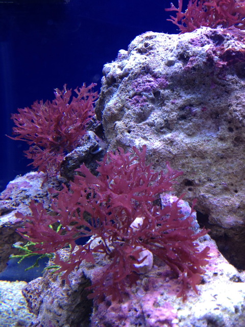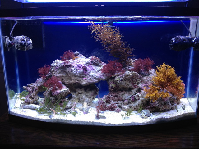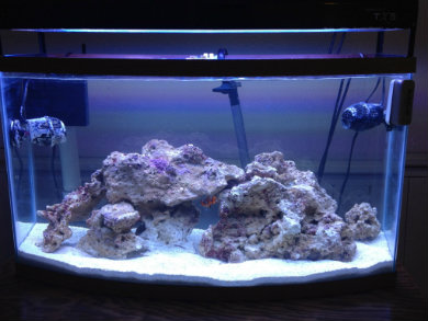 A few months ago I decided that I wanted to set up a new tank inhabited by something other than the typical coral reef style tank. I mulled over the idea of butterfly fish and softies, strictly an anemone dedicated system, or a macro algae and seahorse tank. I narrowed it down to the macros seeing that they are fairly inexpensive, I won't need to heat the tank as much as a reef, I won't need a skimmer, and I won't need to supplement or run tests as much if at all. All of the equipment I am using was all leftover or extra, aside from the overflow. I had the 46 gallon tank and stand all cleaned up and stored in the basement collecting dust. I had the tank drilled and installed a glass-holes overflow leading to a 29 gallon sump. I am using 2 koralia 1050 power heads for flow set up in a gyre fashion. The tank is being heated by a Fluval E300 heater and will be kept at 74 degrees. I do not plan on using a protein skimmer at all and will rely on filter socks as my only means of mechanical filtration. Filtration will be performed by the live rock, macro algae, and by water changes. For lighting, my old aquatinics 36" T5 which I grew SPS under nicely. Coincidently, my brother broke down his tank at the same time and donated his live rock to me. He had previously obtained the rock from live aquaria, he bought show piece size rock. There are 4 rocks total in the tank. The largest weighs 30 pounds, all totaling about 60 pounds. Total water volume is about 60 gallons I estimate.