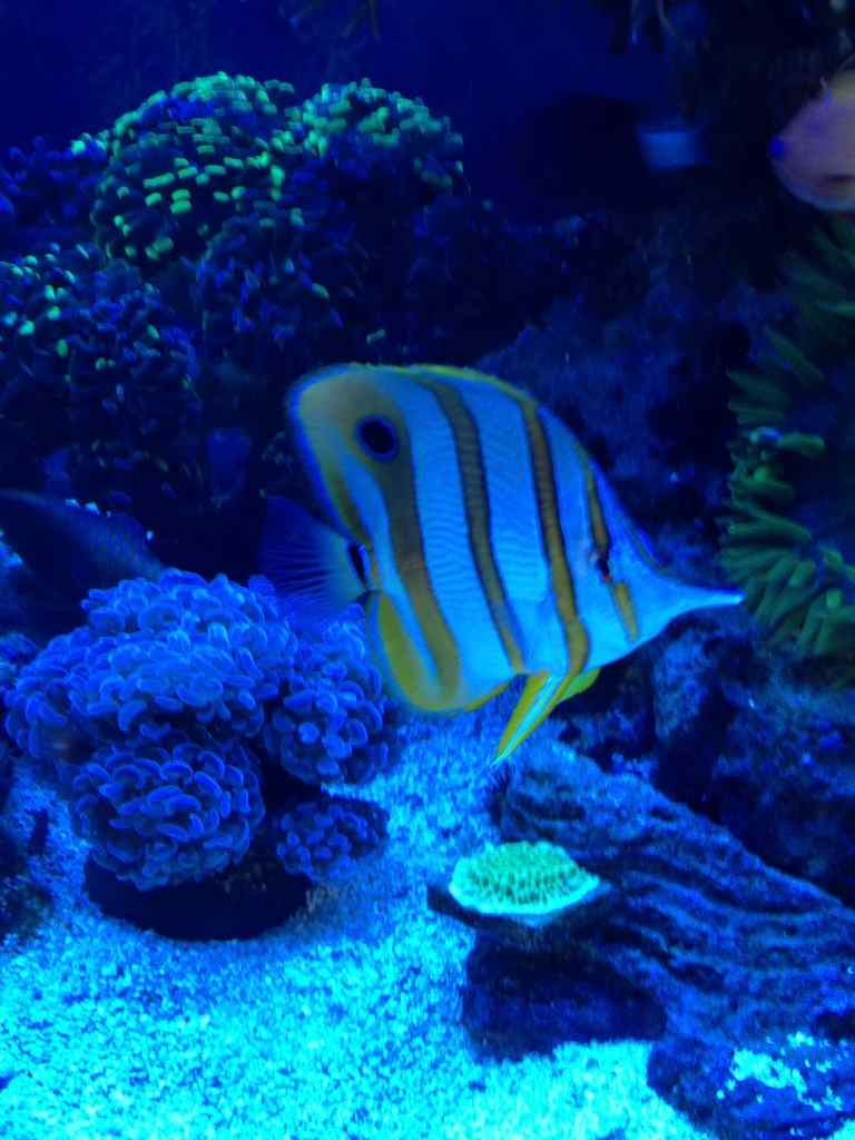 New Copperband Butterfly. Eats PE Mysis like a champ twice daily, probably 30 pieces at each feeding. He is also doing a number on the aptaisia. He comes to the front glass and begs for food, a really nice flashy fish.