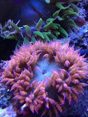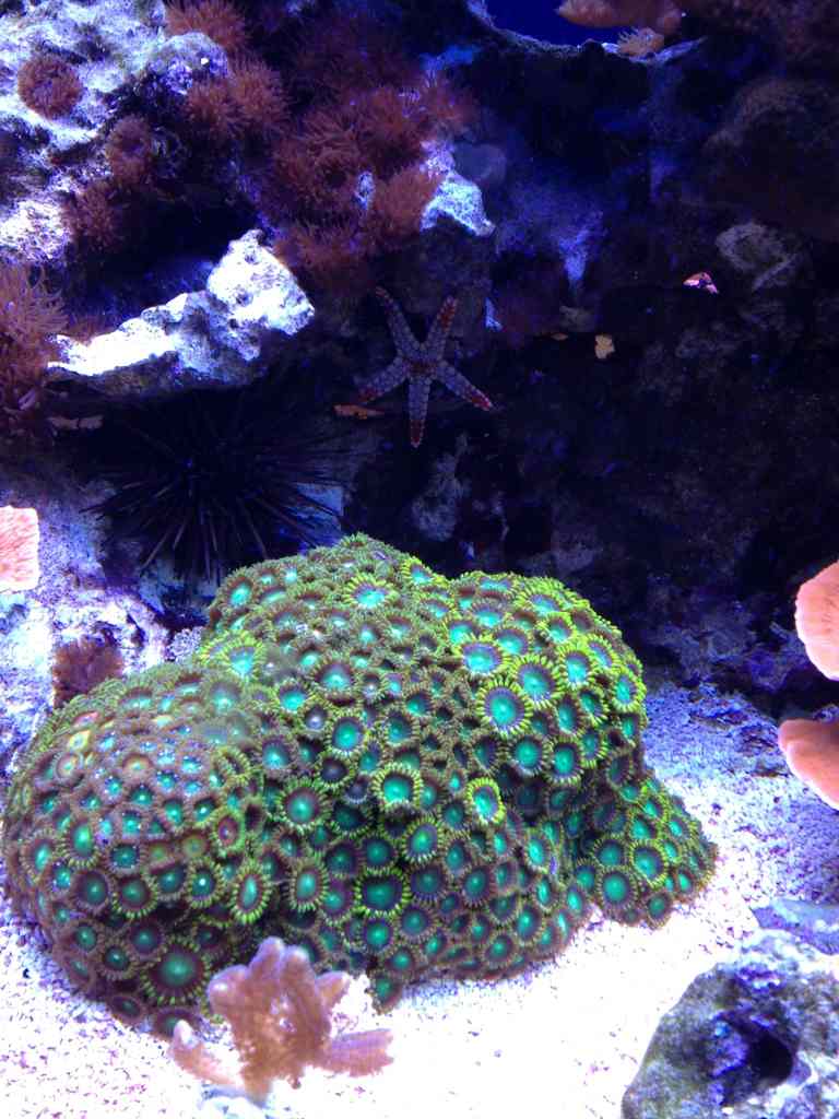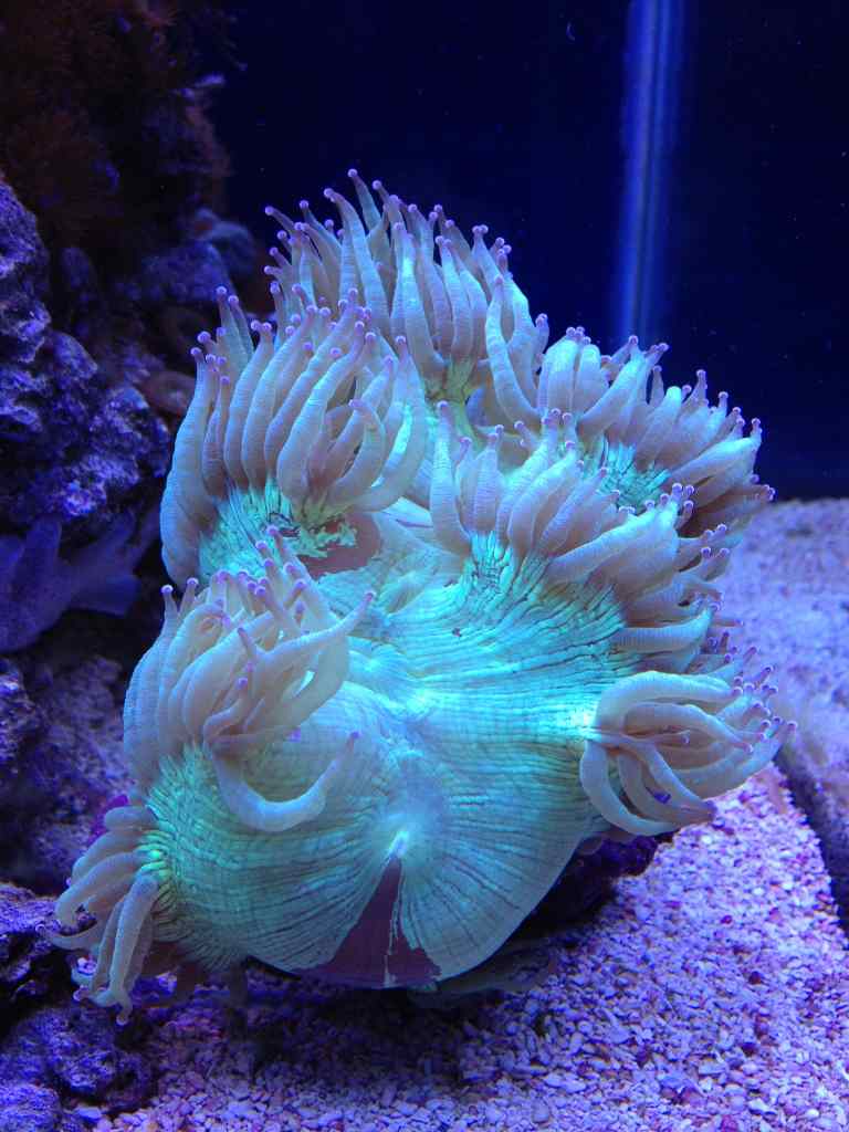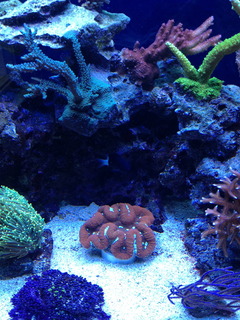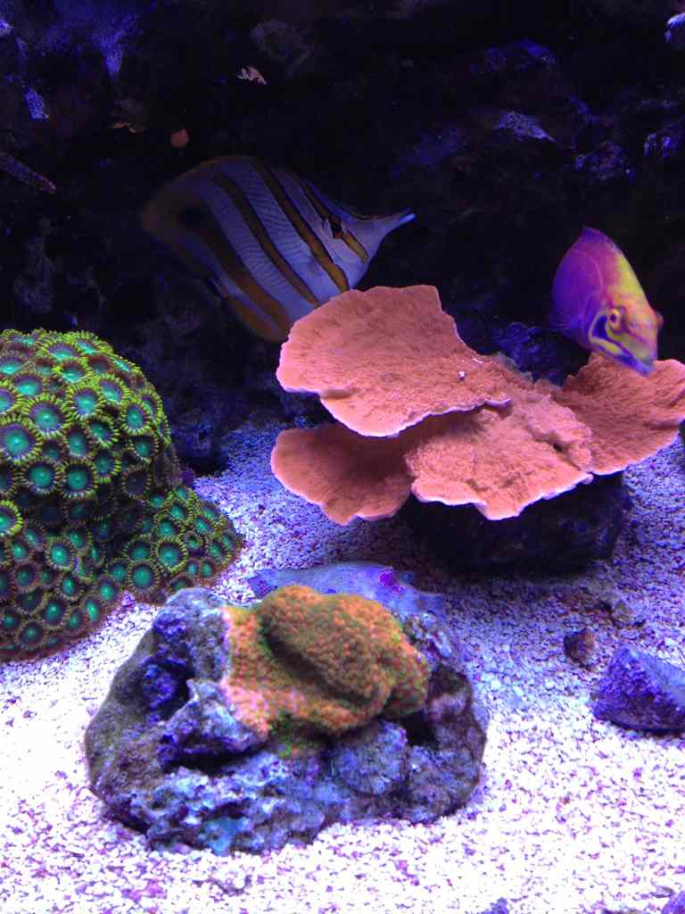 I needed to move the elegance coral to lower flow because it wasn't looking too happy where it was. It's in the bottom right hand corner below the MP10 and looks much better. Its accepting mysis well. I trimmed the star polyp colony on the sand bed quite a bit and replied the elegance with the lobophyllia in the center.