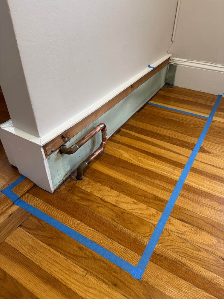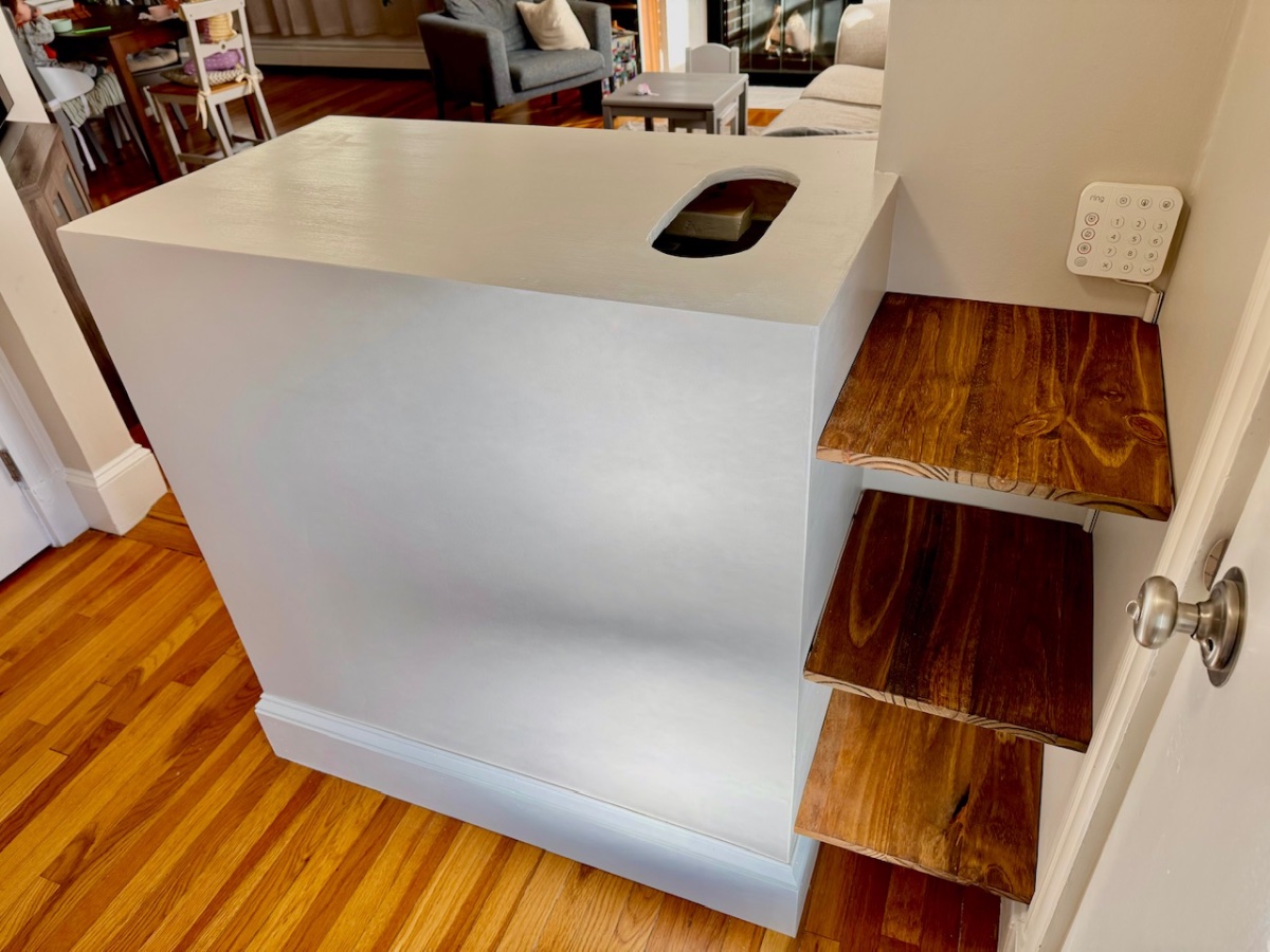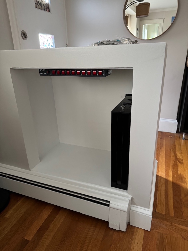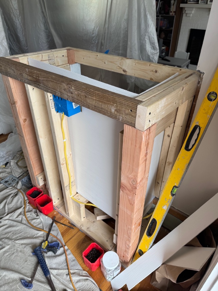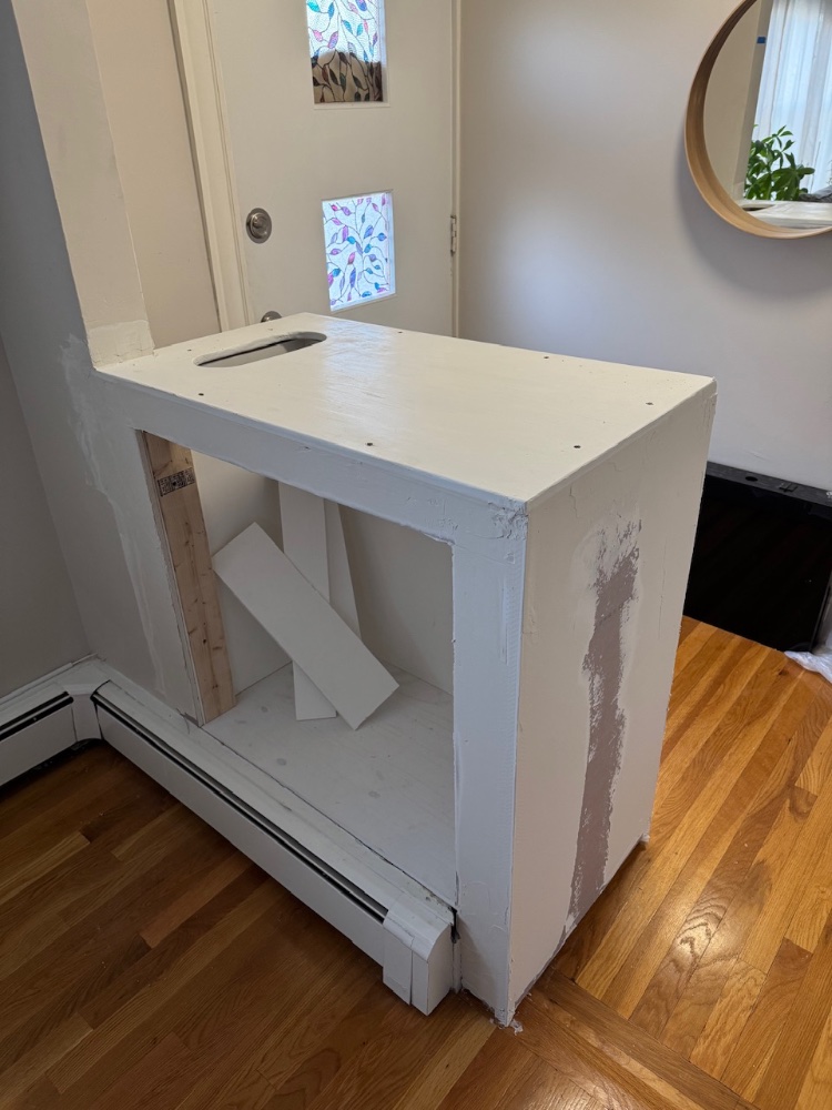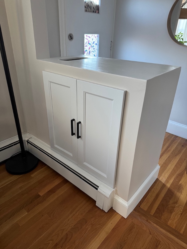 Stand: custom made wall cabinet, wood, plaster and white pvc in the inside