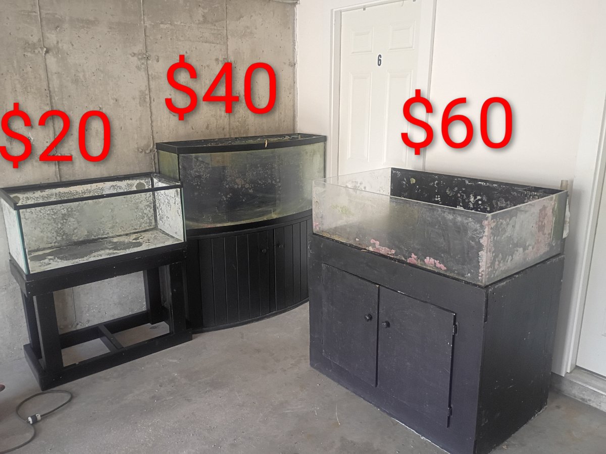 I have a 72 bowfront with sump, a 50gal lowboy acrilic with wet dry, and a 30gal all reef ready. $20 30gal, $40 72 bowfront, $60 for the acrilic.