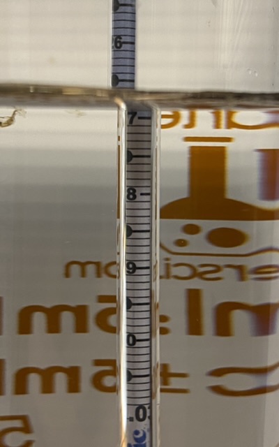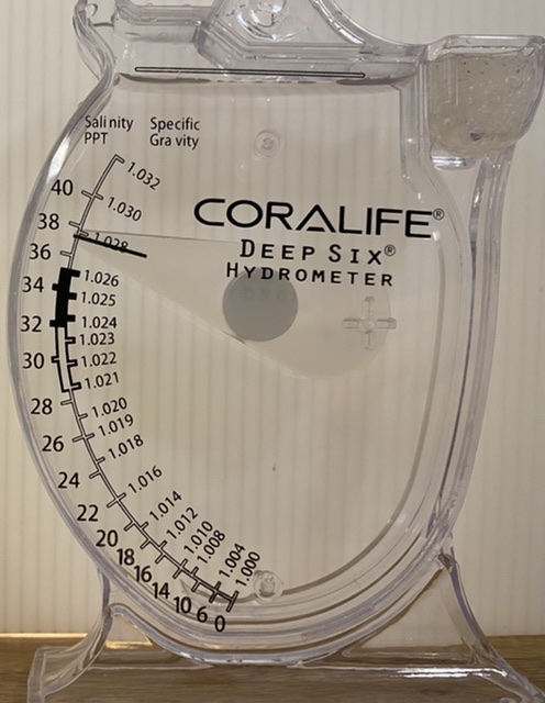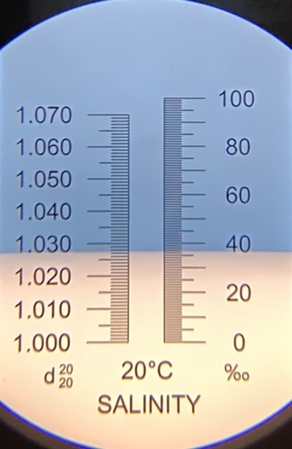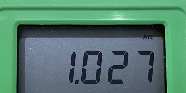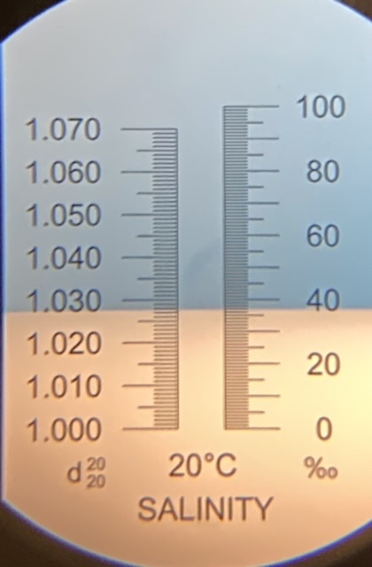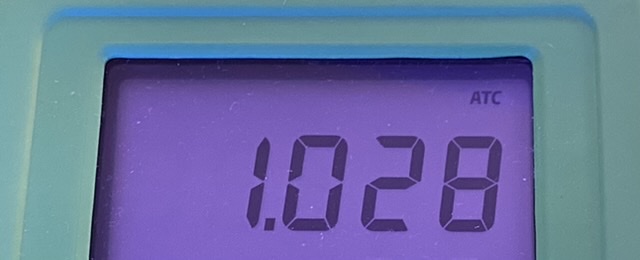 BRS refractometer, just under 1.028. Calibration is slightly off again, or calibration error from yesterday, or maybe an issue with the temperature. This is okay, because I prefer having the reading show on the higher side since the tank runs on the higher end of the safe range. I’ll have to check the calibration again.