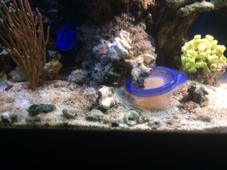 I added the BBS and salt water into the tuperware and used coral scraps inside the feeder to hold it down so it would not float away.