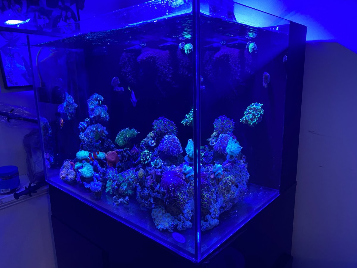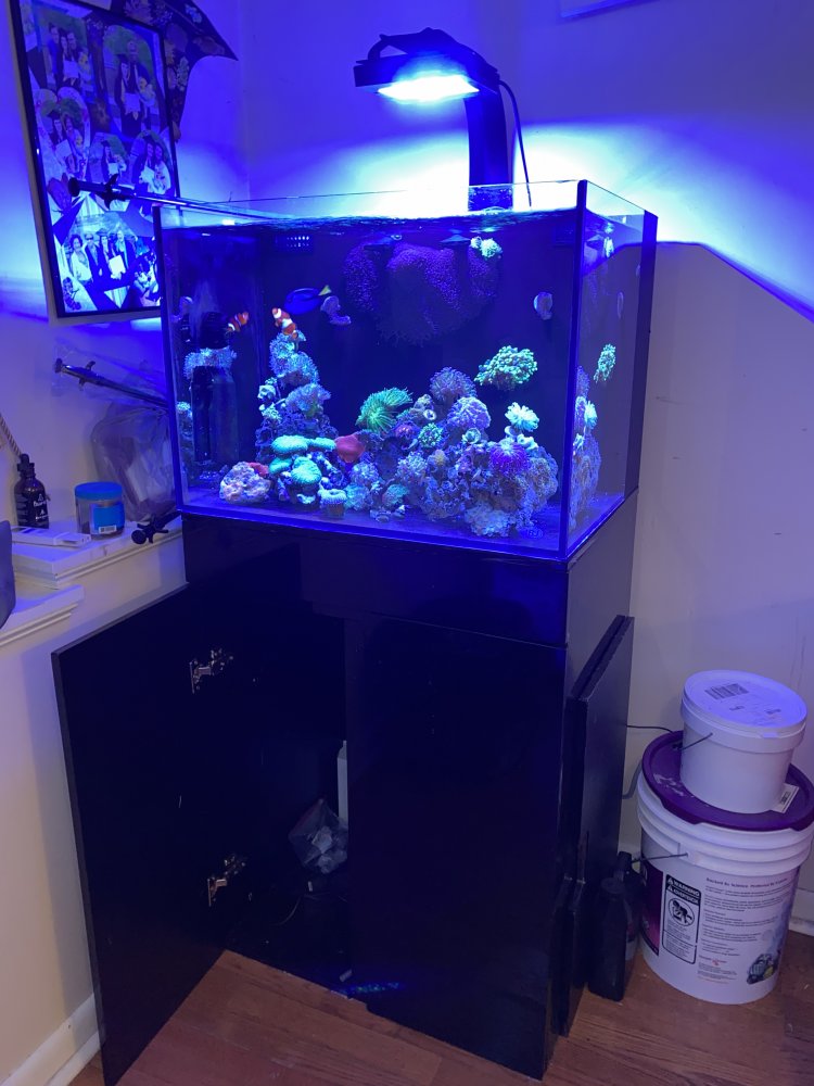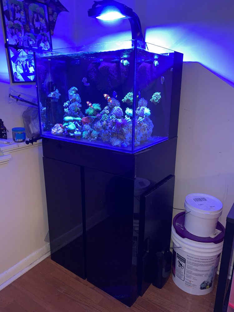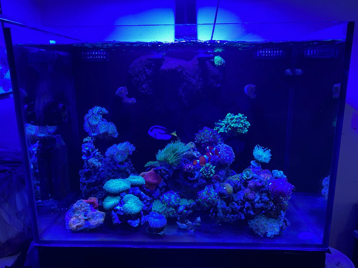 I have a 45g jbj that has been running for about a year or so with 2 clowns and a hippo tang and a harlequin shrimp. This tank also has few colonies if duncan, green mushrooms, captain america mushrooms, frogspawns, blastos, and a few hammers. I have them under a radion xr15 g5 blue that i had purchased also about a year ago. Comes with ecotech battery backup and a MP10, Tunze Ato, Protein skimmer, and RODI system. I also have a few bags of salt and some hanna test kits(ALK/CAL/PHOS). Everything is included that is in the photos besides the Torchs in the display :p