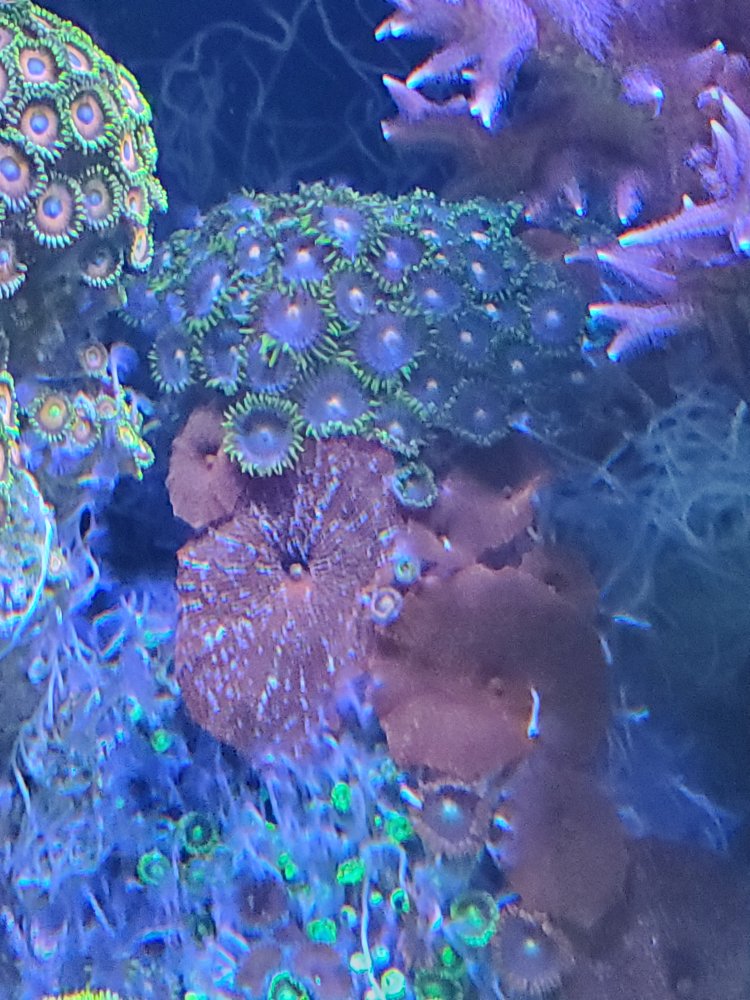 7 inches rock wit over 40 polyps of gorilla niples 6 red mushroom and several toxic green zoas $75 (has some feather duster on it )