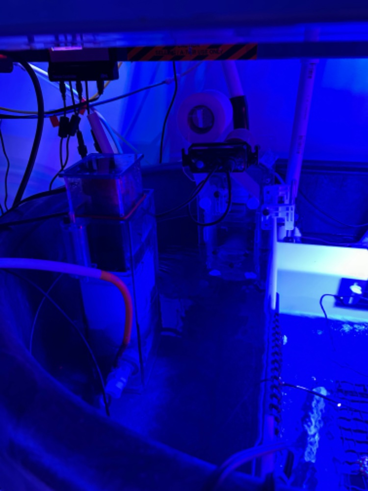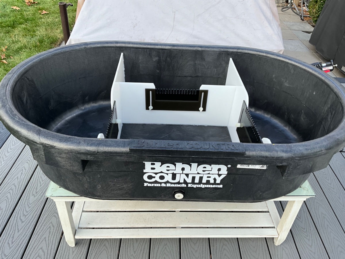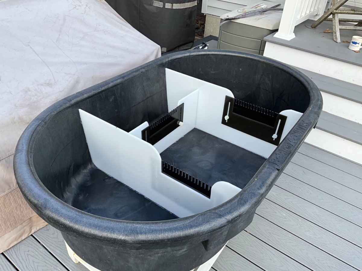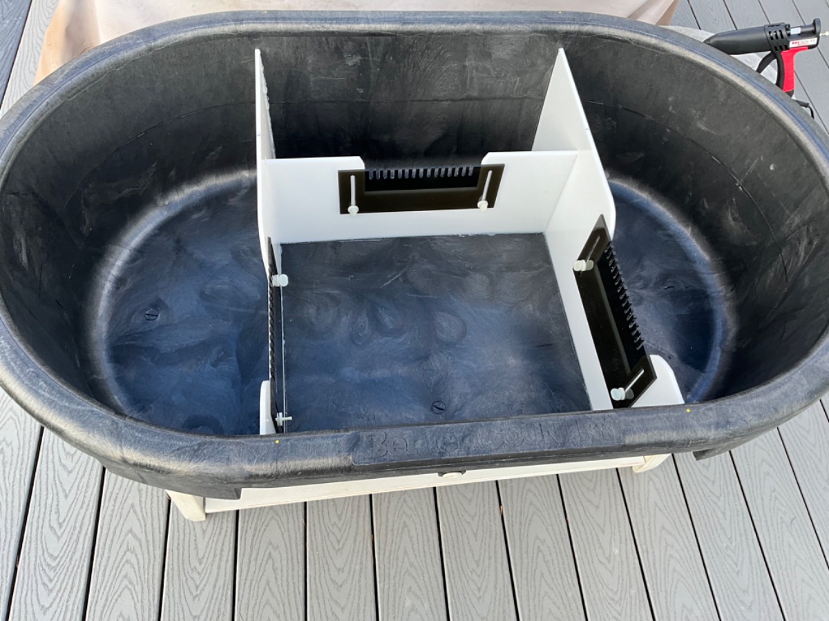 Great day to put this together outside! Tank is 60 gallons from tractor supply, white panels are 1/4” HDPE and the weirs are 1/4” plexi, both from TAP Plastics. I found a company that makes a hot melt glue designed for HDPE and that seems to work like a champ, time will tell.