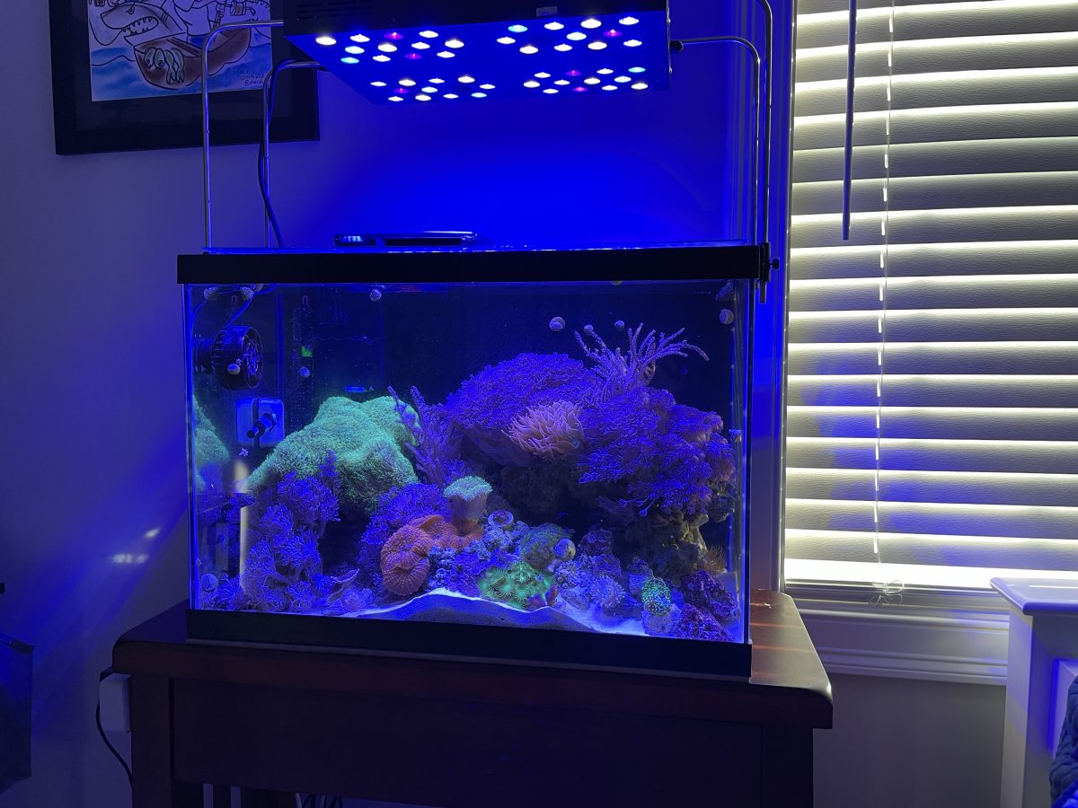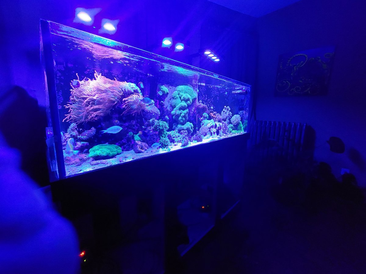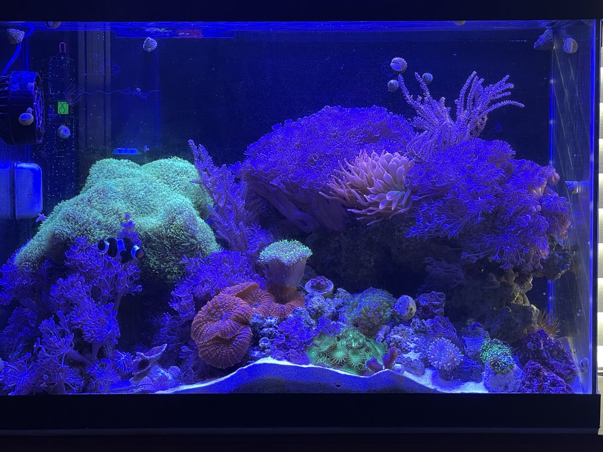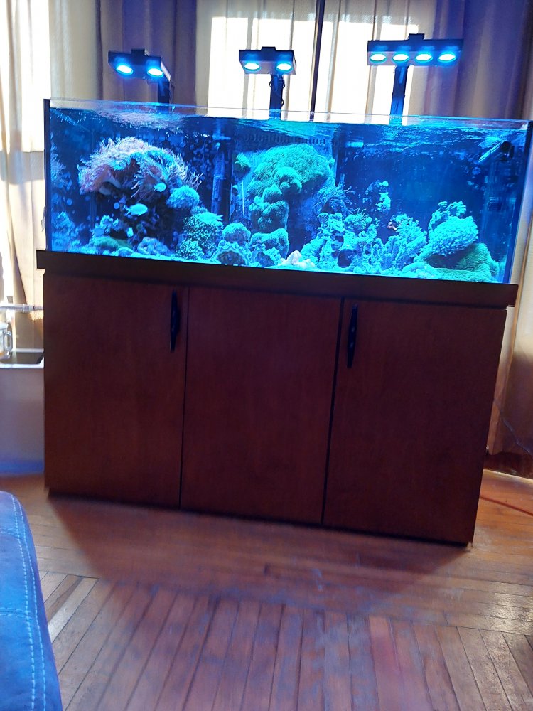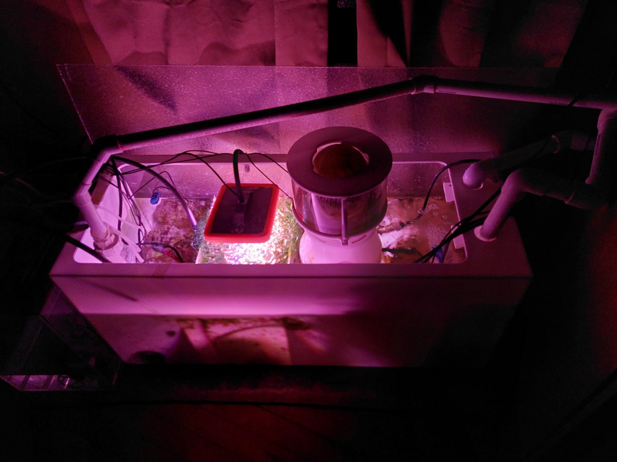 This was upgraded from a tank swap of my 55G last August 2017 For the heart of the system, I run a trigger sapphire 34 sump. Within the sump I run a Deltec xi1000 skimmer, (2) reactors with activated carbon as needed and Biopellets in the other. I run (2) 500 watt heaters (1) is a backup. For my return pump I have the Jebao DCP-10000 sine wave DC unit. I also run a Reef Octopus Varios CR-140 CA reactor with reborn media in it. This is fed from 5lb. bottle of Co2 with a tunze regulator and milwaukee electric solenoid valve and a Aqua UV 25 watt UV sterilizer. Everything is tied into my extensive apex system.My System runs at 78.2 degree avg.