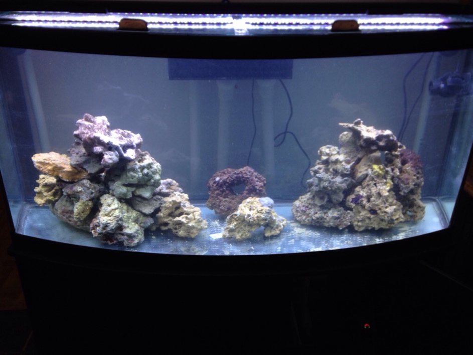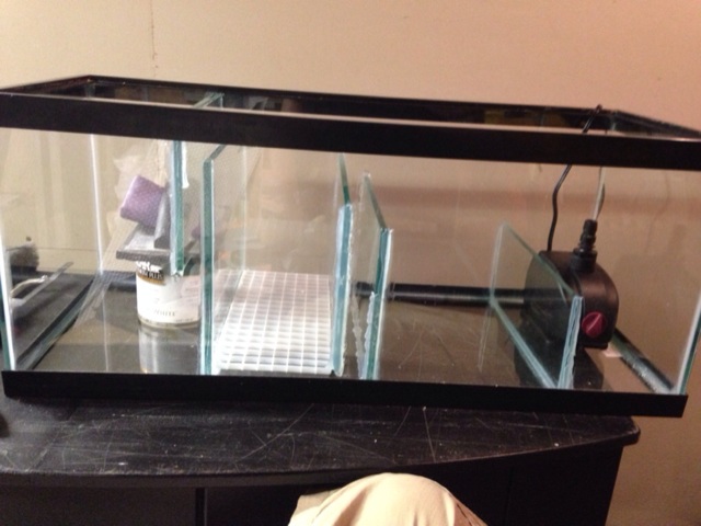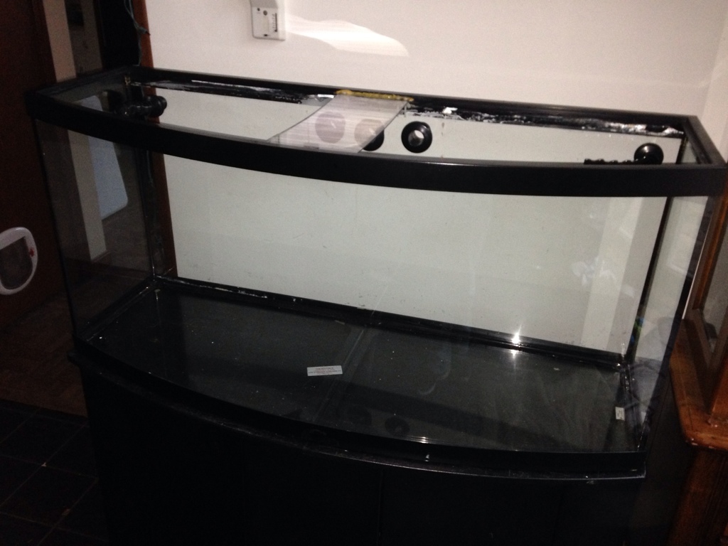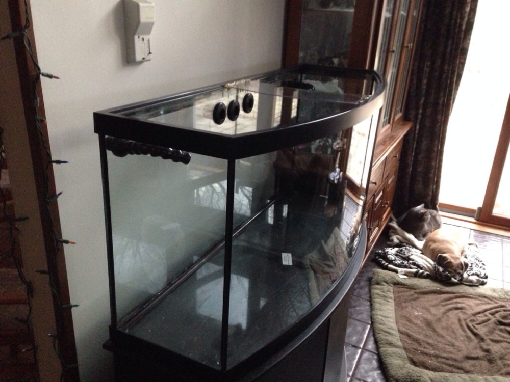 So I finally got all the parts together. I bought the bowfront on a whim last summer for 40 bucks stand and tank! I replaced the broken cross bar with clear acrylic panel, water tested. Built my sump from a 20 gallon long. Now I drill!